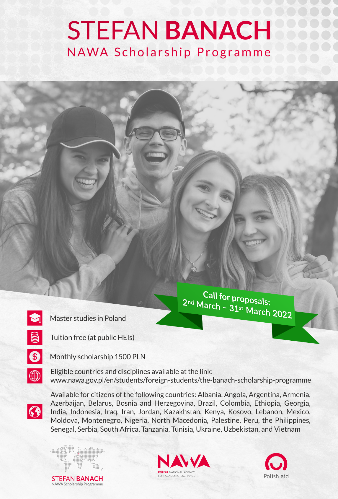 The NAWA scholarship may be applied for by citizens of the following countries: Albania, Angola, Argentina, Armenia, Azerbaijan, Belarus, Bosnia and Herzegovina, Brazil, Colombia, Ethiopia, Georgia, India, Indonesia, Iraq, Iran, Jordan, Kazakhstan, Kenya, Kosovo, Lebanon, Mexico, Moldova, Montenegro, Nigeria, North Macedonia, Palestine, Peru, the Philippines, Senegal, Serbia, South Africa, Tanzania, Tunisia, Ukraine, Uzbekistan, and Vietnam.