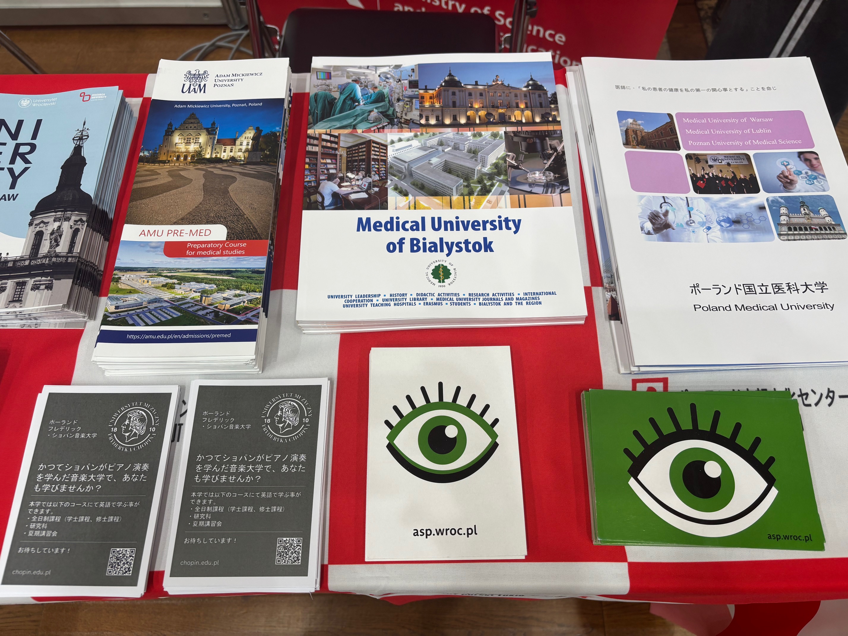ポーランド国家学術交流庁(NAWA)広報・コミュニケーション部および複数のポーランドの大学との協力により、ブースでは人文科学、社会科学、工学、医学、芸術といった多様な分野の資料が紹介されました。今回のフェアのために、各種パンフレットや大学グッズを提供した主な大学は以下の通りです:ヴロツワフ大学、ヴロツワフ美術大学、ビャウィストク医科大学、ポズナンのアダム・ミツキェヴィチ大学、ワルシャワのフレデリック・ショパン音楽大学、ポズナンのイグナツィ・ヤン・パデレフスキ音楽大学、ワルシャワ工科大学。