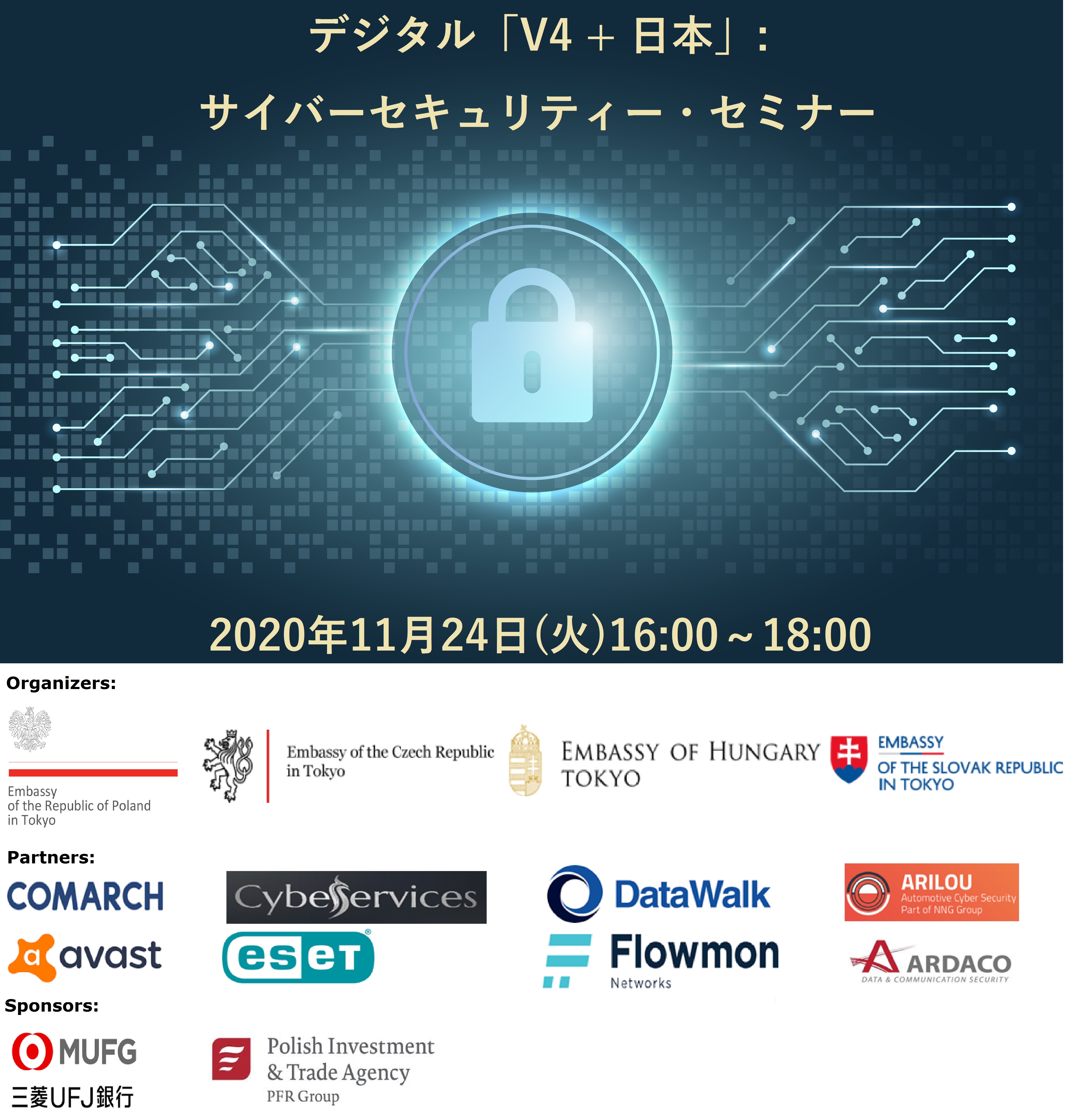 このたび、サイバーセキュリティ需要の高まりを受けると同時に、当分野における日本側パートナーとの協力を深めるため、サイバーセキュリティ・セミナーをオンライン開催する運びとなりました。V4の全4カ国から8企業が自社製品およびサービスをご紹介します。