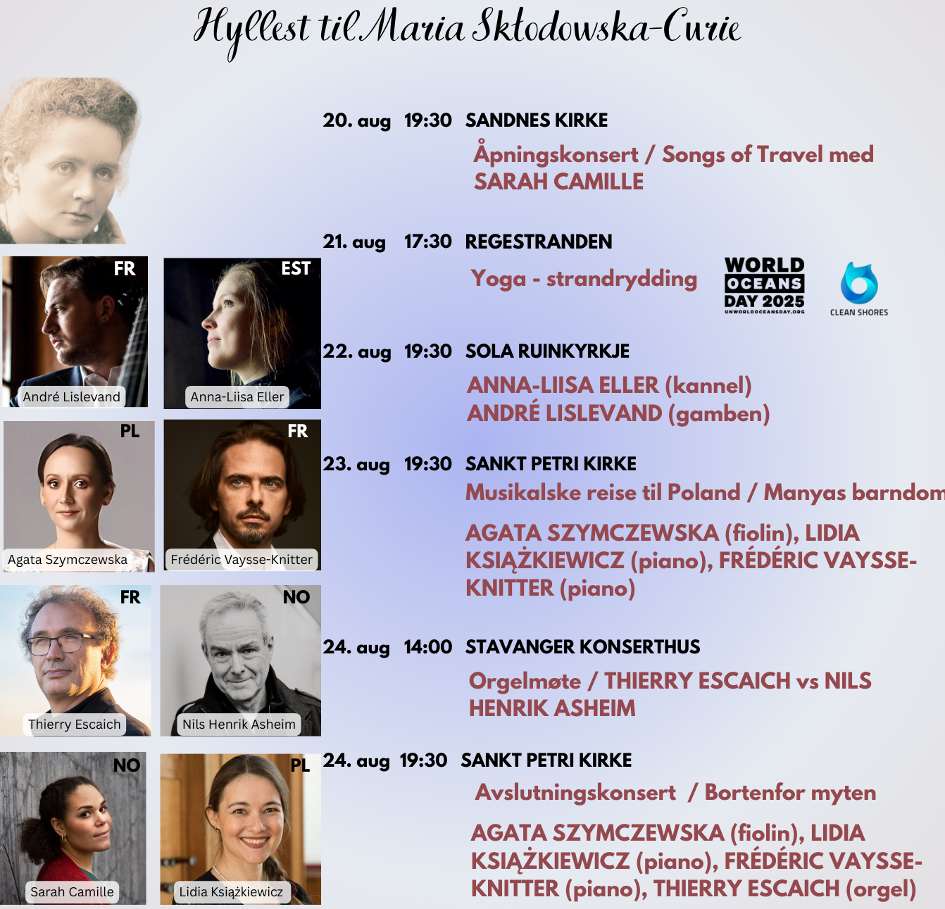 I programmet til den første konserten med tittelen Barndom til Maria: En musikalsk reise til Polen, var det musikk fra Maria Skłodowska-Curies tidligste år - verk av E. Młynarski, J. Paderewski, K. Szymanowski og F. Chopin. I den andre konserten, Bortom mytene, lød verk av F. Liszt, Thierry Escaich, Clara og Robert Schumann, H. Wieniawski og K. Szymanowski. I pausene mellom verkene ble det lest brev fra Skłodowska-Curie til fremtredende skikkelser fra hennes tid, tilgjengeliggjort for arrangørene takket være barnebarnet til nobelprisvinneren. Konsertene samlet et lokalt norsk-polsk-fransk publikum, interessert i klassisk musikk.