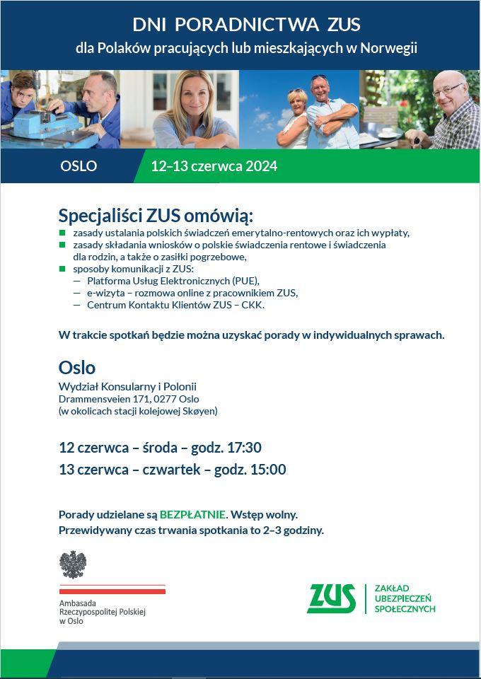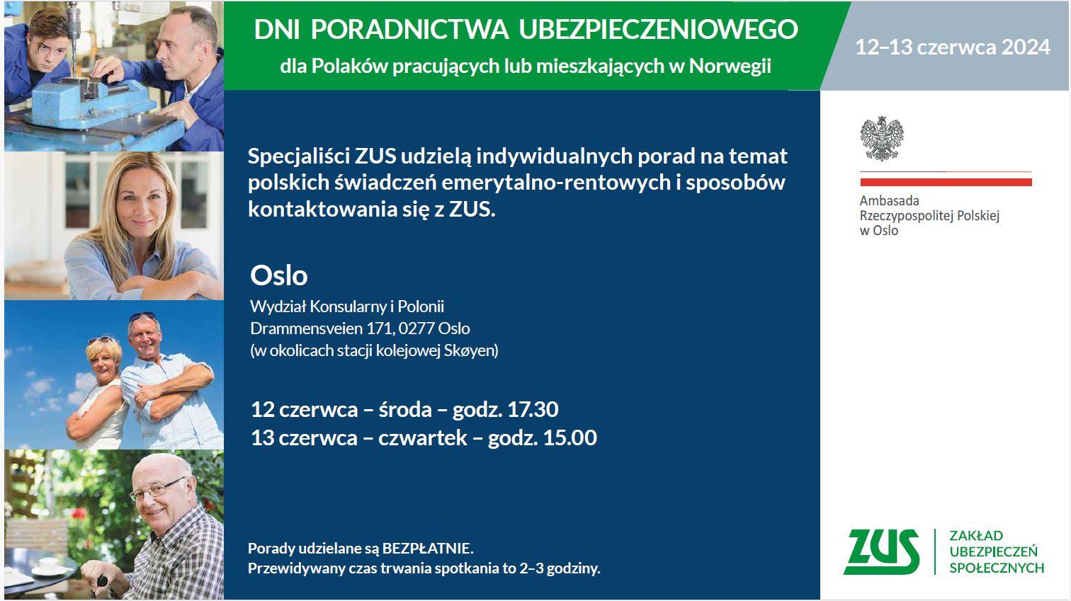 12 i 13 czerwca 2024 r. Wydział Konsularny i Polonii Ambasady RP w Oslo organizuje Dni Poradnictwa ZUS.