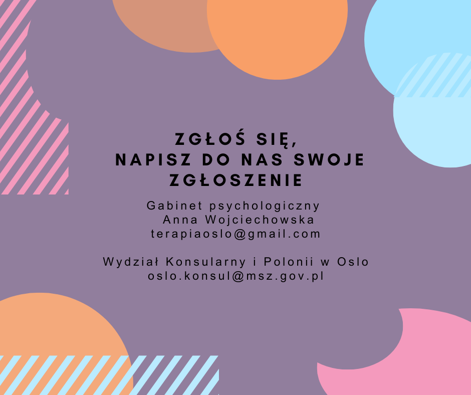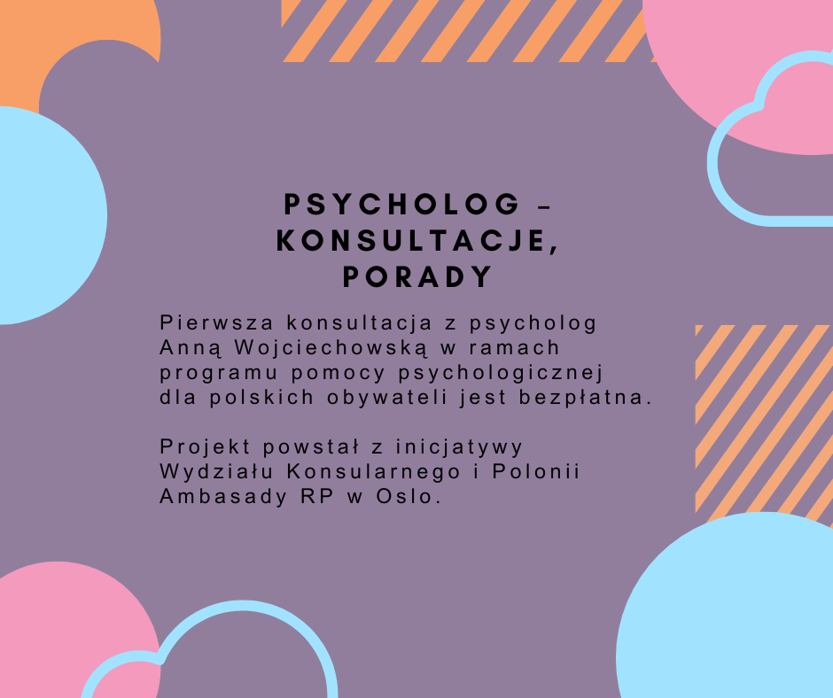 Wydział Konsularny i Polonii Ambasady RP w Oslo oferuje konsultacje psychologiczne, które mogą pomóc Ci przejść przez trudniejsze chwile. W naszej inicjatywie udział bierze psycholog Anna Wojciechowska.
