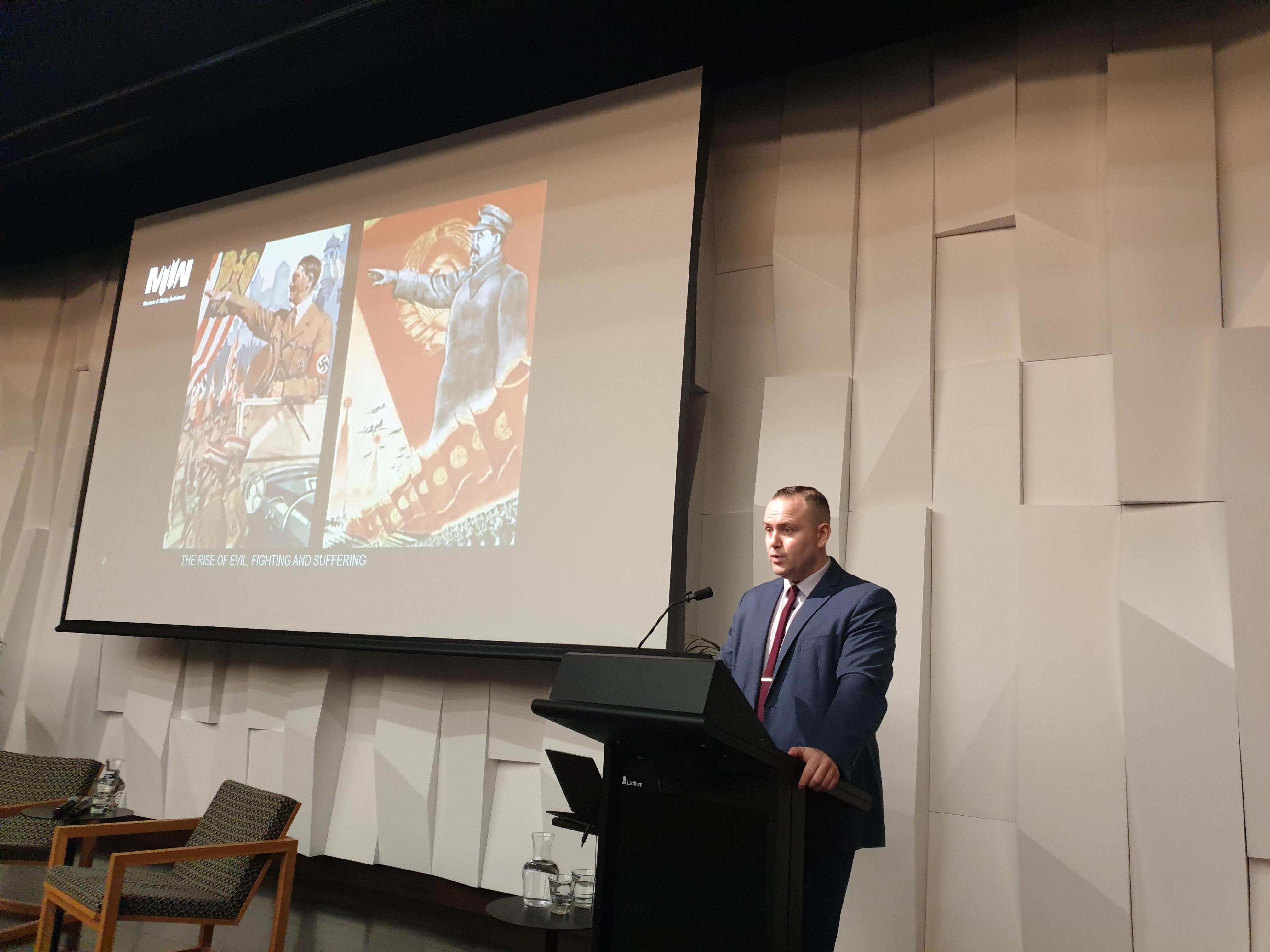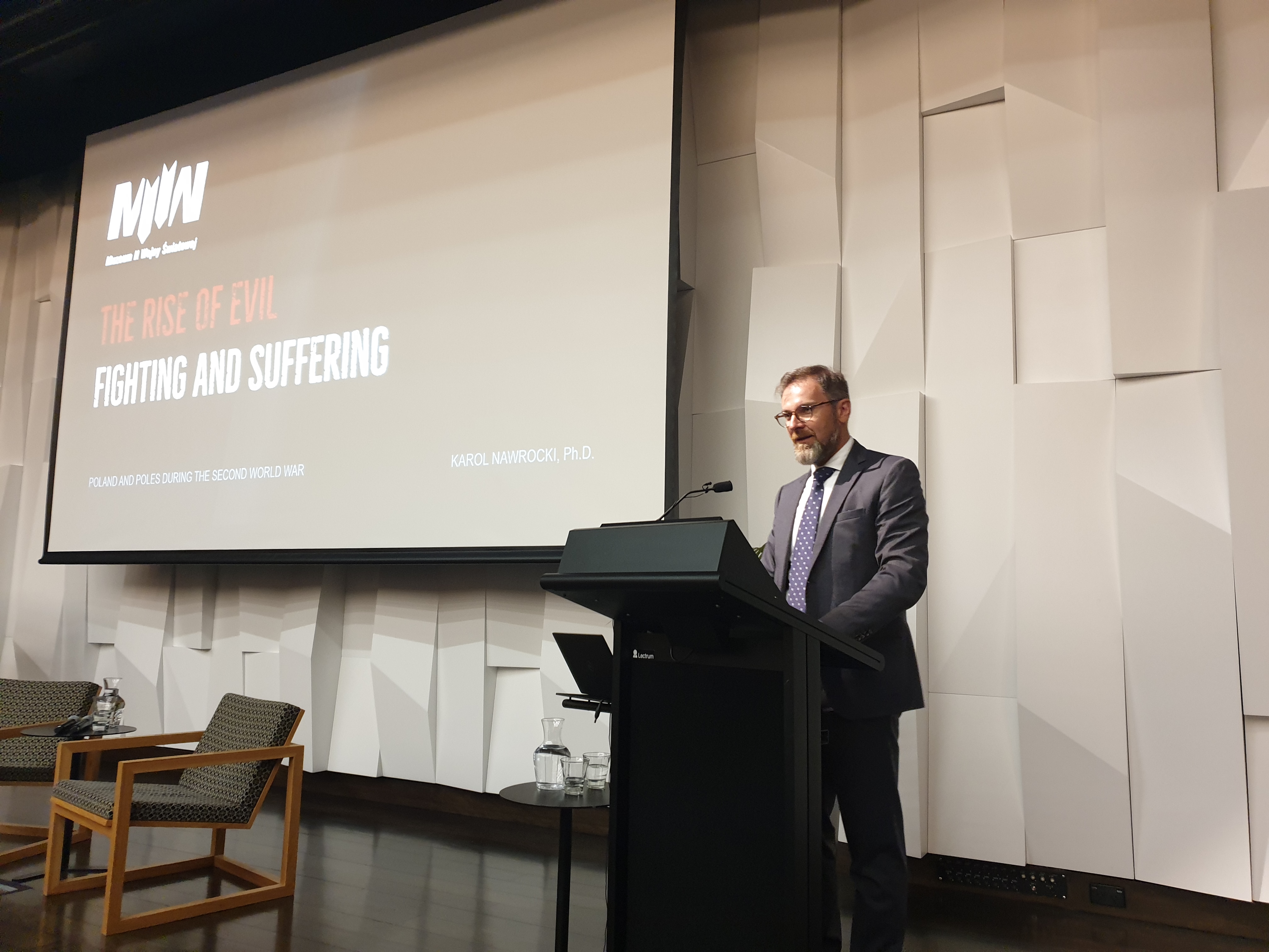 W Wellingtonie głównym punktem programu był wykład „Narodziny zła. Walka i cierpienie” wygłoszony przez Dyrektora K. Nawrockiego w Bibliotece Narodowej Nowej Zelandii, tuż po którym otwarta została wystawa „Fighting and Suffering” przygotowana przez Muzeum II Wojny Światowej wspólnie z Ministerstwem Spraw Zagranicznych RP.