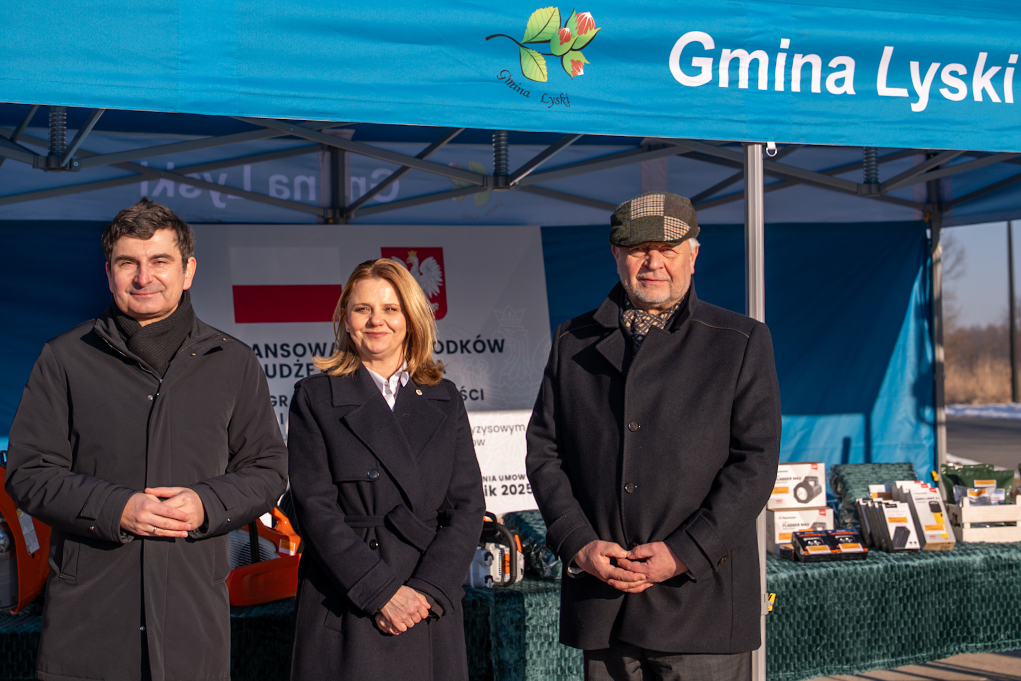 Na wyposażenie Gminy Lyski trafiły m.in. namioty ekspresowe wraz z zestawami oświetlenia, stacje ładujące, maszty oświetleniowe, nagrzewnica, agregat prądotwórczy, paczkowarka do wody oraz minikoparka i ciągnik.