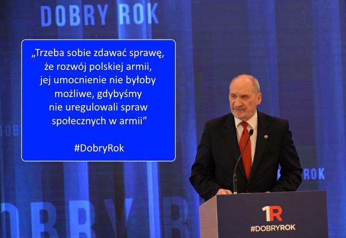 Szef resortu podkreślił, iż trzeba sobie zdawać sprawę, że rozwój polskiej armii, jej umocnienie nie byłoby możliwe, gdybyśmy nie uregulowali spraw społecznych w armii. To wymagało uruchomienia podwyżek dla pracowników cywilnych w wojsku, którzy od 8 lat nie dostawali żadnej podwyżki. Zarówno oni, jak i żołnierze zostali objęci podwyżkami w wysokości od 300 do 400 zł.