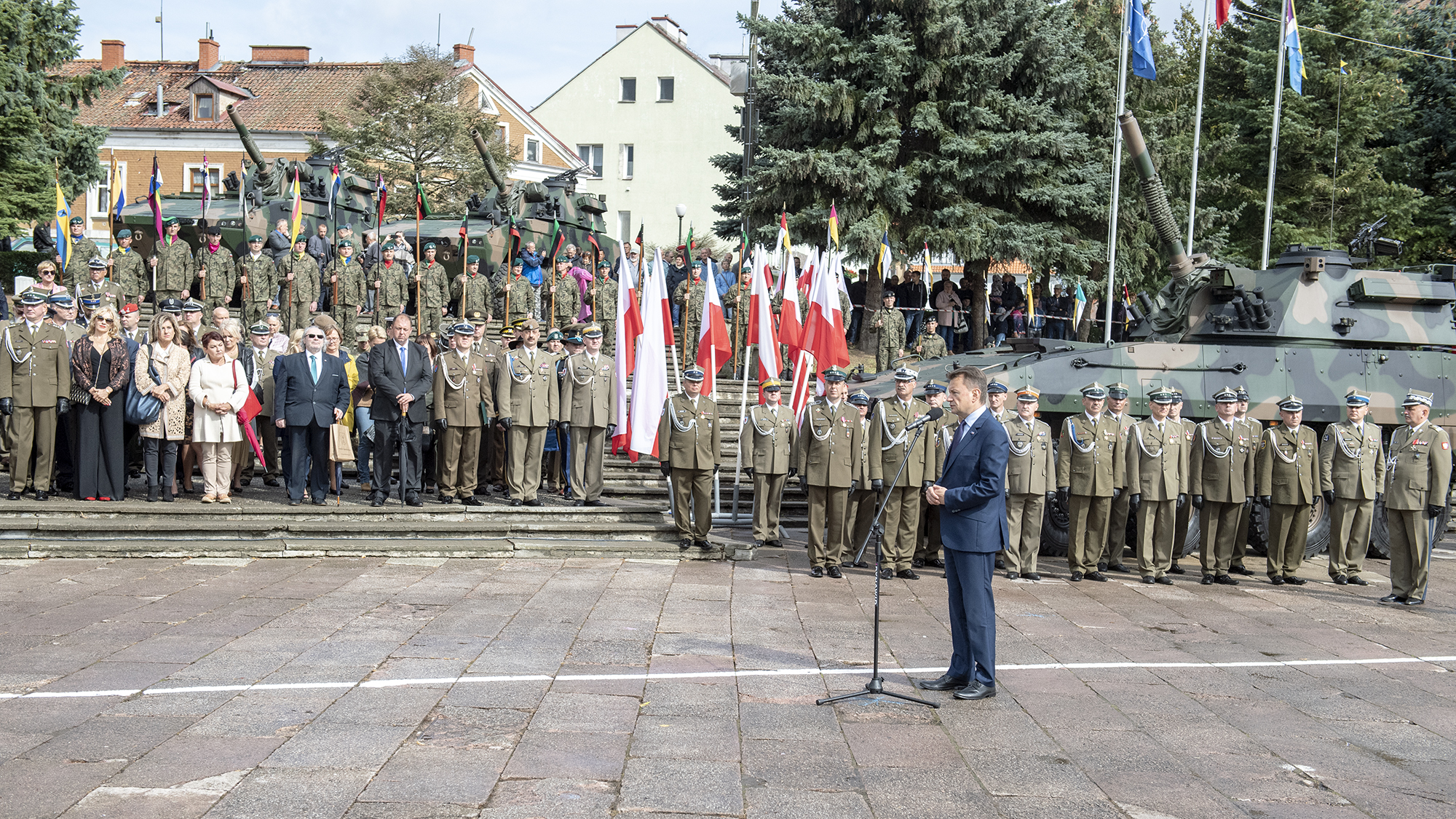 Szef MON przypomniał o działaniach jakie są w tej chwili prowadzone, aby Wojsko Polskie było liczniejsze i wyposażone w nowoczesny sprzęt. Jako przykład podał kampanię rekrutacyjną Zostań żołnierzem Rzeczypospolitej oraz utworzenie 18. Dywizji Zmechanizowanej. - W odróżnieniu od rządu koalicji PO-PSL, który ograniczał liczebnie Wojsko Polskie, ponieważ w 2011 roku zlikwidował 1. Warszawską Dywizję Zmechanizowaną im. Tadeusza Kościuszki, rząd premiera Mateusza Morawieckiego, rząd Prawa i Sprawiedliwości wzmacnia Wojsko Polskie. Namacalnym dowodem wzmocnienia polskich sił zbrojnych szczególnie w północnowschodniej i północnej części kraju, na wschodniej flance NATO, jest tak jak powiedziałem przesunięcie dowództwa 16 Dywizji do woj. warmińsko-mazurskiego, uzupełnianie stanu 16 Dywizji i wyposażenie wojska w nowoczesny sprzęt – powiedział minister.