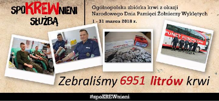 Funkcjonariusze służb podległych MSWiA i pracownicy cywilni służb oraz żołnierze i pracownicy cywilni Wojska Polskiego, w ogólnopolskiej zbiórce krwi trwającej cały marzec, oddali 6951 litrów krwi. Akcja „SpoKREWnieni Służbą” odbywała się pod honorowym patronatem Mariusza Błaszczaka, ministra obrony narodowej oraz Joachima Brudzińskiego, ministra spraw wewnętrznych i administracji.