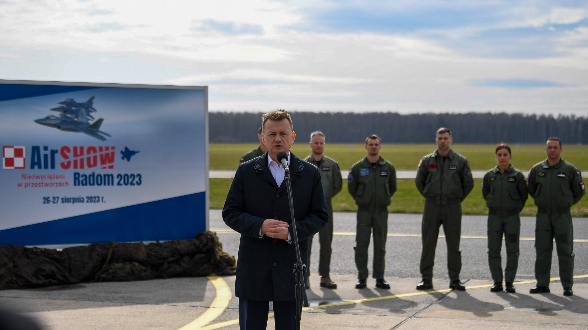 „Za 5 miesięcy, w ostatni weekend sierpnia właśnie tu, w Radomiu odbędzie się międzynarodowy pokaz lotniczy Air Show 2023. Międzynarodowy pokaz lotniczy odbędzie się pod hasłem „Niezwyciężeni w przestworzach”. Odwołujemy się do wielkiego sukcesu polskiego pilota sprzed 90 lat. Kapitan Stanisław Skarżyński pobił rekord świata przelatując przez południowy Atlantyk z Senegalu, z Afryki, do Brazylii, do Ameryki Południowej. (...) Pamiętamy o tym wybitnym człowieku, wybitnym pilocie. Ale przede wszystkim staramy się wzmocnić polskie Siły Powietrzne. W związku z tym zaprezentowane zostaną w zasadzie wszystkie typy statków powietrznych wykorzystywanych w Siłach Powietrznych” - poinformował wicepremier-minister obrony narodowej Mariusz Błaszczak podczas konferencji prasowej w 42. Bazie Lotnictwa Szkolnego.