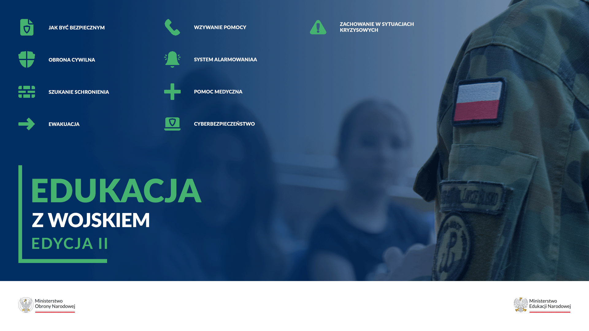 Ministerstwo Edukacji Narodowej wspólnie z Ministerstwem Obrony Narodowej uruchamia drugą edycję programu dla szkół podstawowych i ponadpodstawowych pn. „Edukacja z wojskiem”. W szkołach, które zostaną zgłoszone do programu odbędą się zajęcia teoretyczne i praktyczne z udziałem żołnierzy. Uczniowie poznają zasady postępowania w sytuacjach zagrożenia, zapoznają się z sygnałami alarmowymi, powtórzą techniki udzielania pierwszej pomocy.