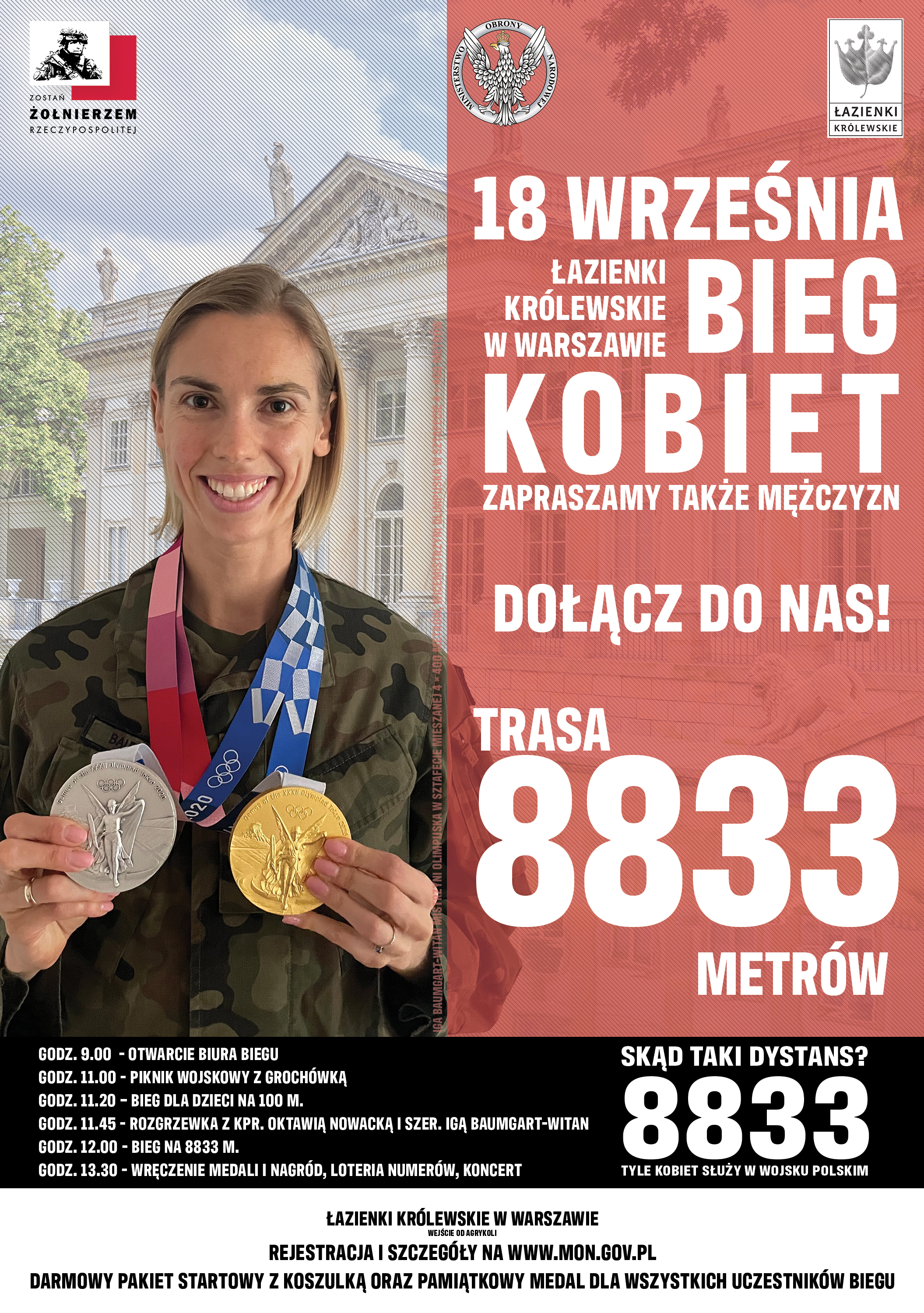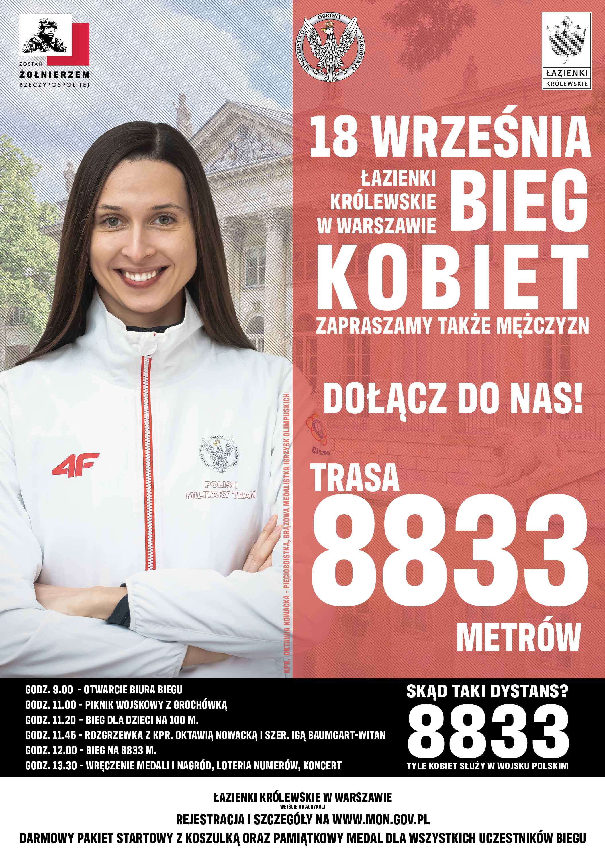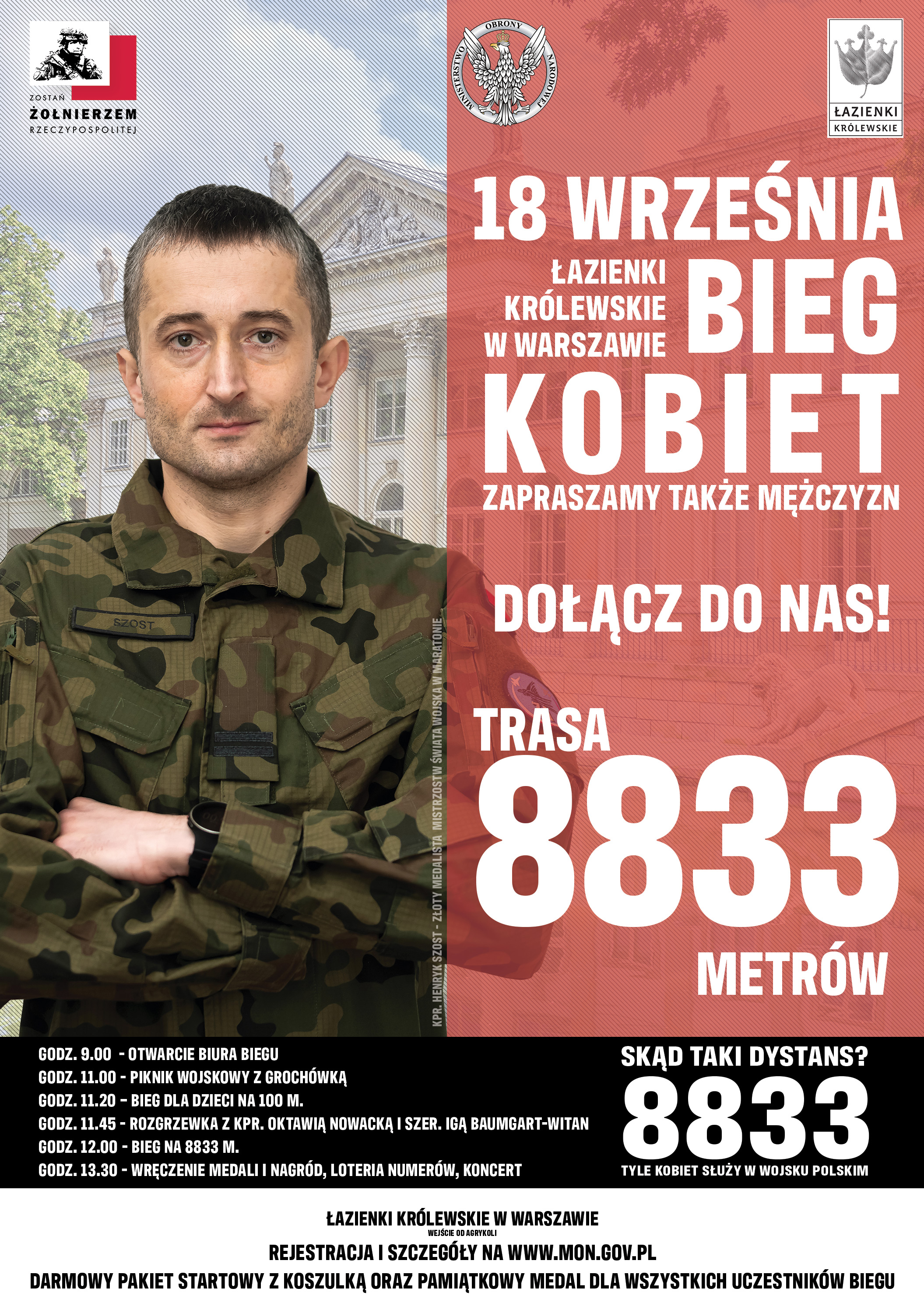 W sobotę 18 września br. w Łazienkach Królewskich w Warszawie o godz. 12.00 wystartuje wyjątkowy bieg. Na dystansie 8833 metrów pobiegnie 600 osób – wśród nich kobiety, które na co dzień noszą mundur Wojska Polskiego i służą w Siłach Zbrojnych. Dystans został określony tak, żeby reprezentował 8833 kobiety, które obecnie czynnie służą w Siłach Zbrojnych.