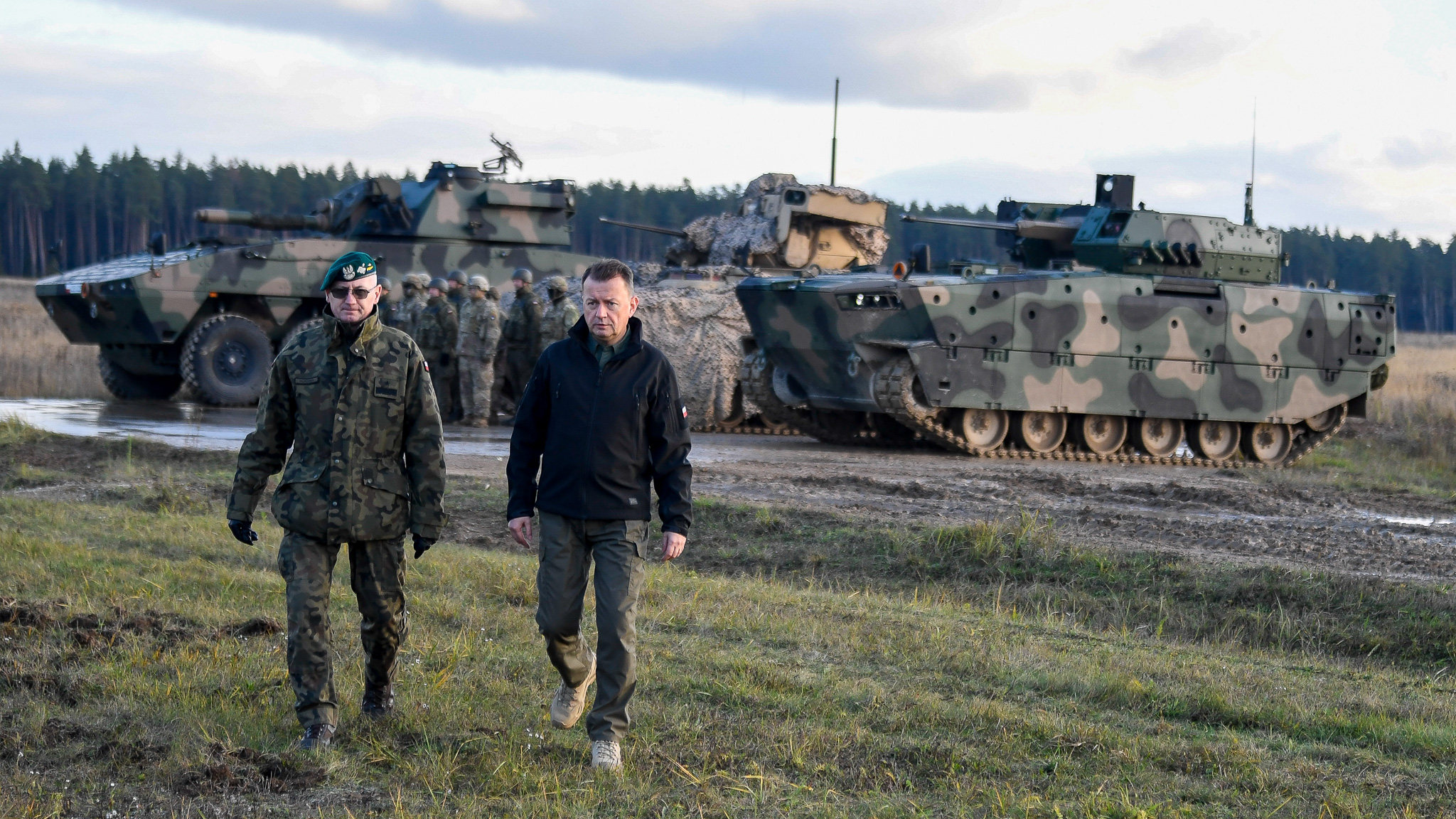 - Konsekwentnie modernizujemy wyposażenie Wojska Polskiego. Jednym z ważnych elementów tego procesu jest zastąpienie wysłużonych bojowych wozów pancernych nowymi pojazdami. Te nowe pojazdy muszą odznaczać się tym, że są z najwyższej półki. Tym, że są interoperacyjne ze sprzętem naszych sojuszników. Stąd też, nie przypadkiem, obok testowanego bojowego wozu pancernego Borsuk stoi amerykański Bradley. Zależy nam na tym, żeby ten sprzęt był interoperacyjny ze sprzętem sojuszników z NATO - powiedział Mariusz Błaszczak, wicepremier, minister obrony narodowej podczas spotkania z żołnierzami na poligonie w Orzyszu.