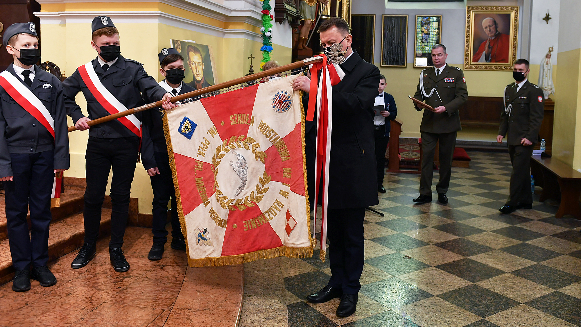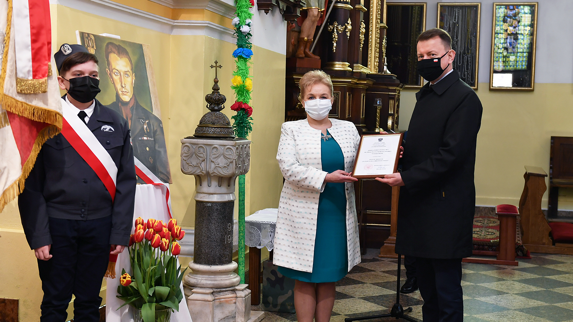 W środę, 5 maja br., minister Mariusz Błaszczak uczestniczył w uroczystości zorganizowanej w Kolegiacie w Radzyminie, podczas której odsłonięto tablicę upamiętniającą polskiego pilota podpułkownika Mariana Pisarka, patrona Szkoły Podstawowej nr 1 w Radzyminie. Szef MON udekorował również sztandar Szkoły medalem "Za zasługi dla obronności kraju”.