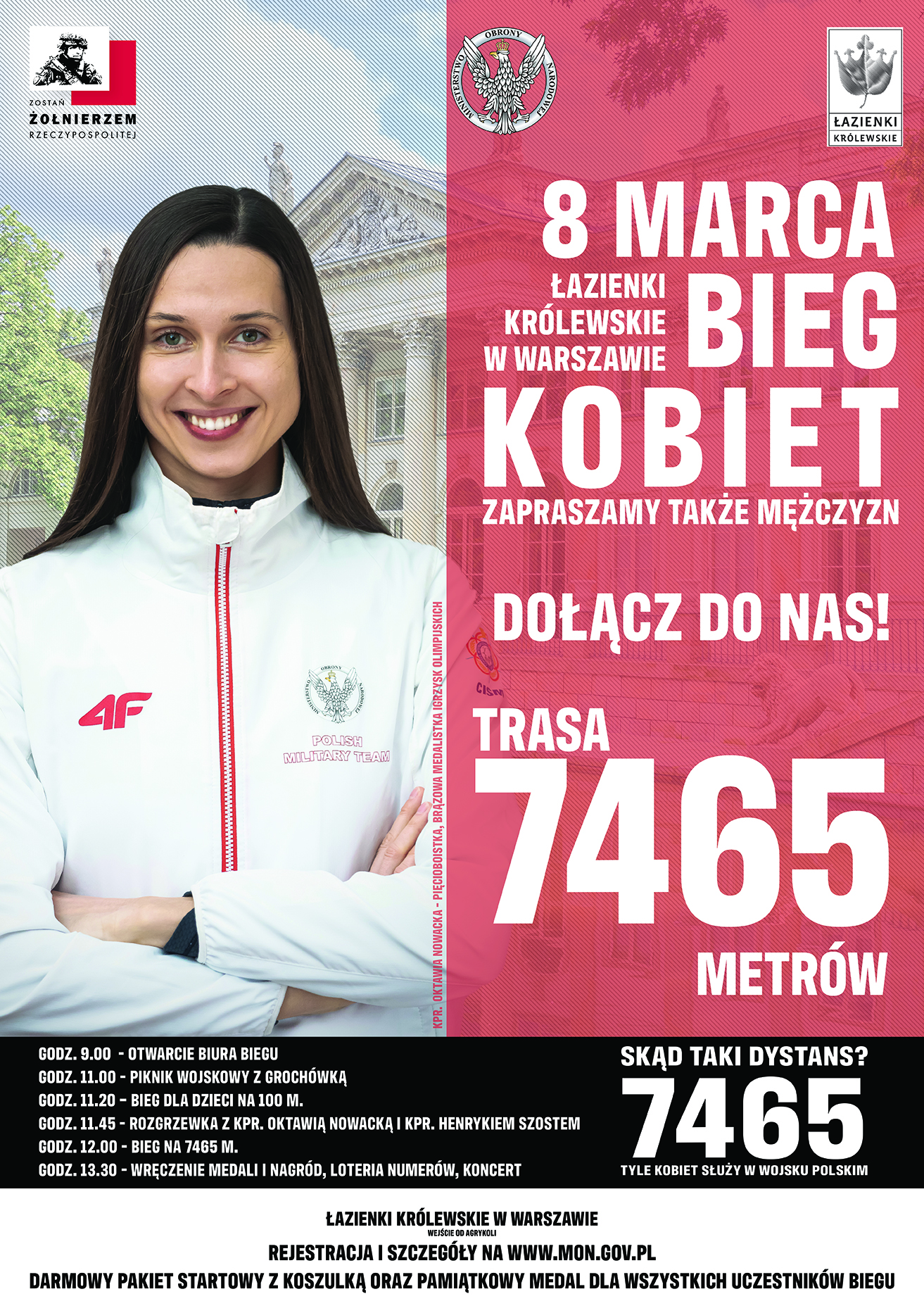W niedzielę, 8 marca br. w Łazienkach Królewskich w Warszawie o godz. 12.00 wystartuje wyjątkowy bieg. Na dystansie 7465 metrów pobiegnie 600 osób – wśród nich kobiety, które na co dzień noszą mundur Wojska Polskiego i służą w Siłach Zbrojnych. Specjalnie przygotowaną rozgrzewkę poprowadzą wielokrotni medaliści – kapral Oktawia Nowacka i kapral Henryk Szost.