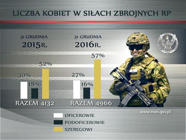 Przypomniała, że obecnie w polskiej armii służy prawie 5 tys. kobiet-żołnierzy oraz że kobiety zajmują stanowiska cywilne w armii – Mają dostęp do wszystkich wojskowych stanowisk, stopni, służą we wszystkich rodzajach sił zbrojnych. Kobiety pełniące służbę w polskiej armii mają w takim samym stopniu jak mężczyźni dostęp do edukacji wojskowej, szkół i szkoleń, często zostają prymuskami szkół oficerskich i kursów – zwróciła uwagę pełnomocnik MON.
