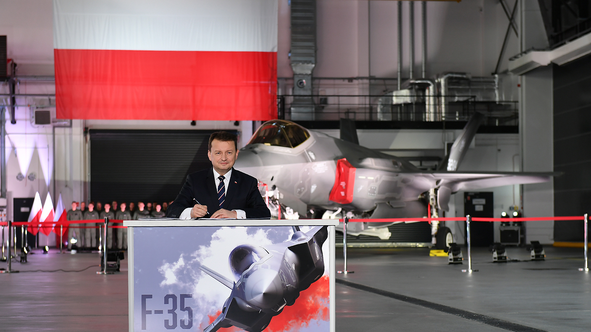 - Polskie siły powietrzne wchodzą na nowy etap swojego rozwoju. Dołączamy do elitarnego grona państw, które posiadają F-35, a więc samoloty stanowiące swoiste centra dowodzenia, samoloty wyróżniające się interoperacyjnością - powiedział Mariusz Błaszczak, minister obrony narodowej w hangarze dęblińskiego 4. Skrzydła Lotnictwa Szkolnego po podpisaniu umowy na zakup samolotów F-35.