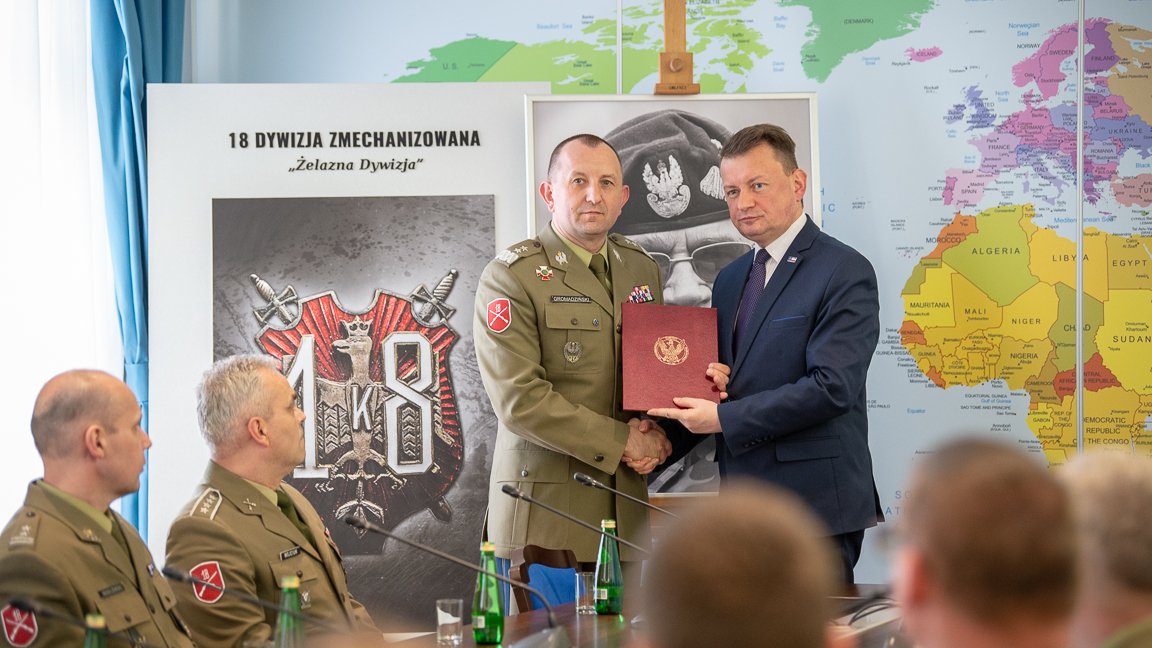 - Przed chwilą wysłuchałem meldunku złożonego przez generała dywizji Jarosława Gromadzińskiego, dotyczącego formowania 18. Dywizji. Jestem zadowolony z tego, co usłyszałem. Wszystko przebiega zgodnie z harmonogramem – powiedział Mariusz Błaszczak, minister obrony narodowej po zakończeniu odprawy z żołnierzami dowództwa 18. Dywizji Zmechanizowanej.