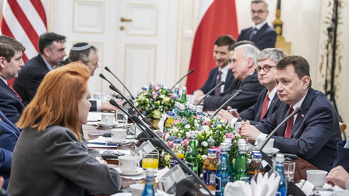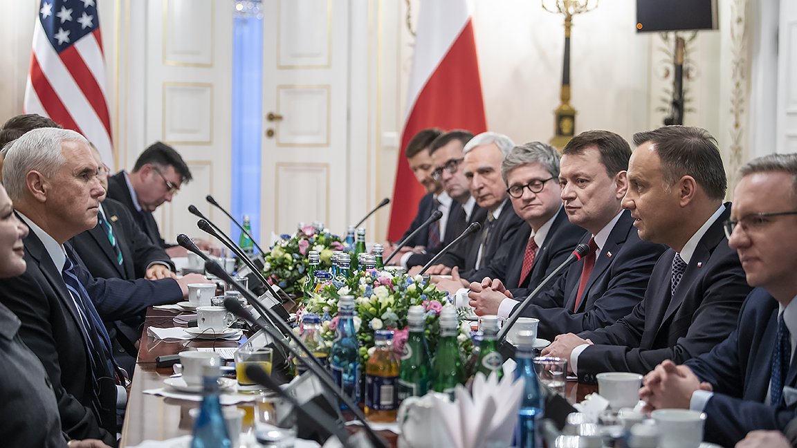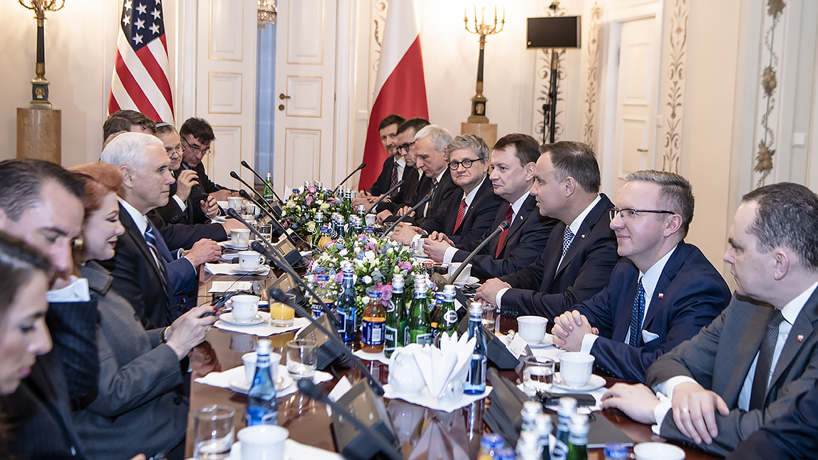 Mariusz Błaszczak minister obrony narodowej uczestniczył również w spotkaniu dwustronnym prezydenta Andrzeja Dudy z wiceprezydentem Stanów Zjednoczonych Ameryki Północnej Michaelem Pencem, które odbyło się w Belwederze w Warszawie. Rozmowy dotyczyły m.in. obecności wojska USA w Polsce w ramach natowskiej grupy bojowej oraz amerykańskiej inicjatywy wsparcia możliwości obronnych krajów europejskich.