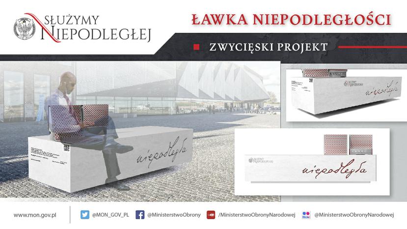 Ministerstwo Obrony Narodowej rozstrzygnęło konkurs na opracowanie projektu ławki pomnikowej upamiętniającej 100. rocznicę odzyskania przez Polskę niepodległości. Komisja konkursowa przyznała nagrodę główną pani Marcie Rosiak za nowatorski projekt ławki pomnikowej. To właśnie takie ławki staną w polskich miejscowościach. - Idea ławki nawiązuje do słów marszałka Piłsudskiego „Niepodległość nie jest Polakom dana raz na zawsze” – podkreśla pani Marta Rosiak.
