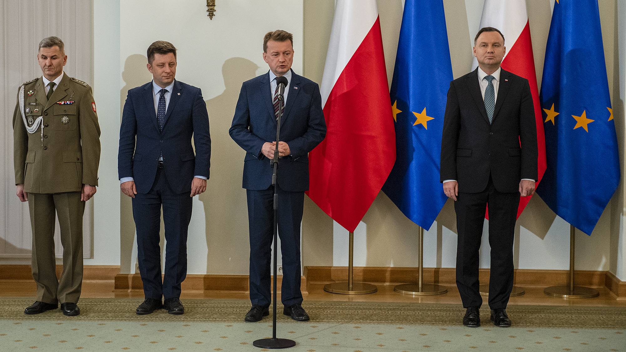 Szef MON wziął udział w uroczystości w Pałacu Prezydenckim, gdzie w obecności prezydenta Andrzeja Dudy, przedstawiciele fundacji Wolność i Demokracja oraz Muzeum Wojska Polskiego podpisali dokument przekazania odnalezionego po 80 latach sztandaru 4. Pułku Ułanów Zaniemeńskich.