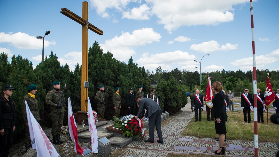 Podczas wizyty w Stalowej Woli minister Mariusz Błaszczak złożył wieńce przy pomniku twórcy Centralnego Okręgu Przemysłowego wicepremiera Eugeniusza Kwiatkowskiego oraz pod krzyżem upamiętniającym strajki w Hucie Stalowa Wola w 1988 r.