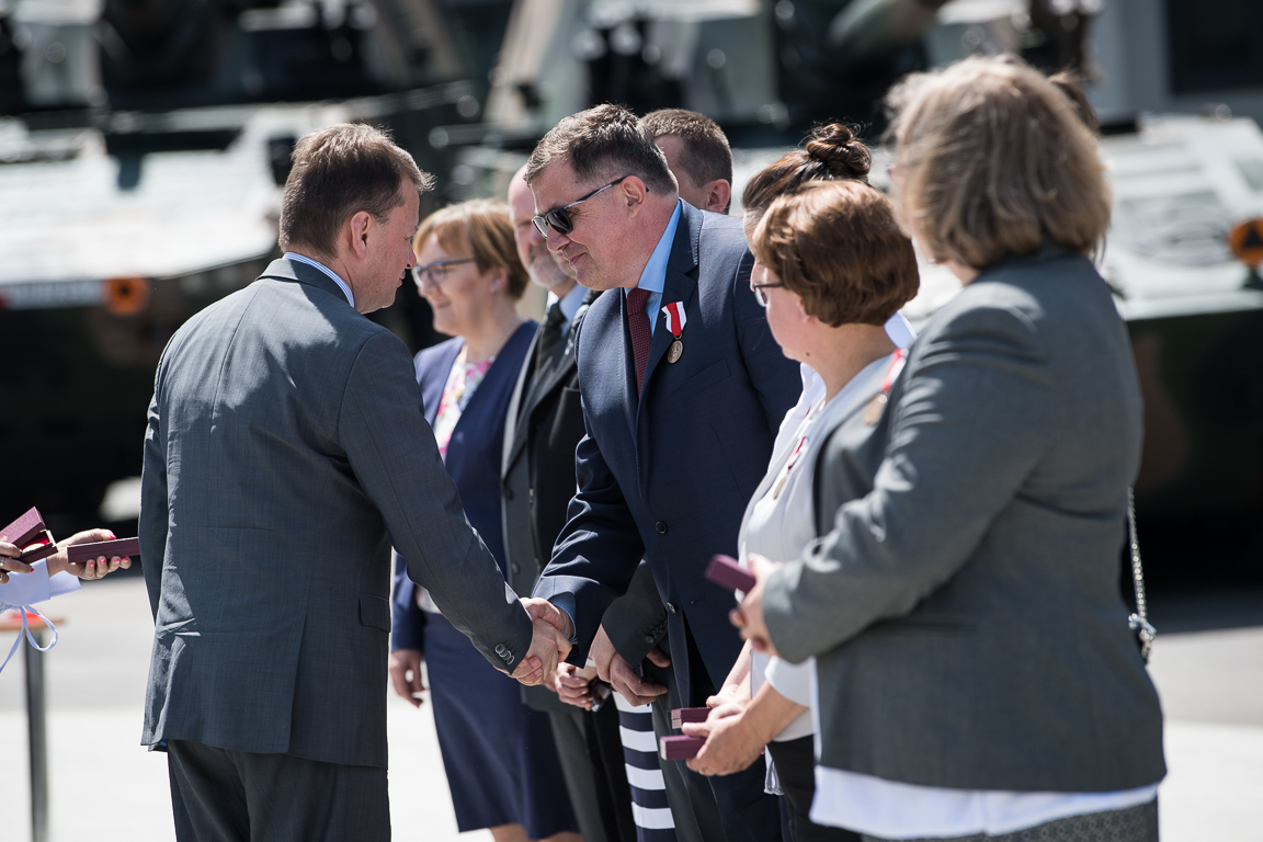 Mariusz Błaszczak, minister obrony narodowej odznaczył również złotymi, srebrnymi i brązowymi medalami Za zasługi dla obronności kraju oraz listami gratulacyjnymi pracowników HSW.