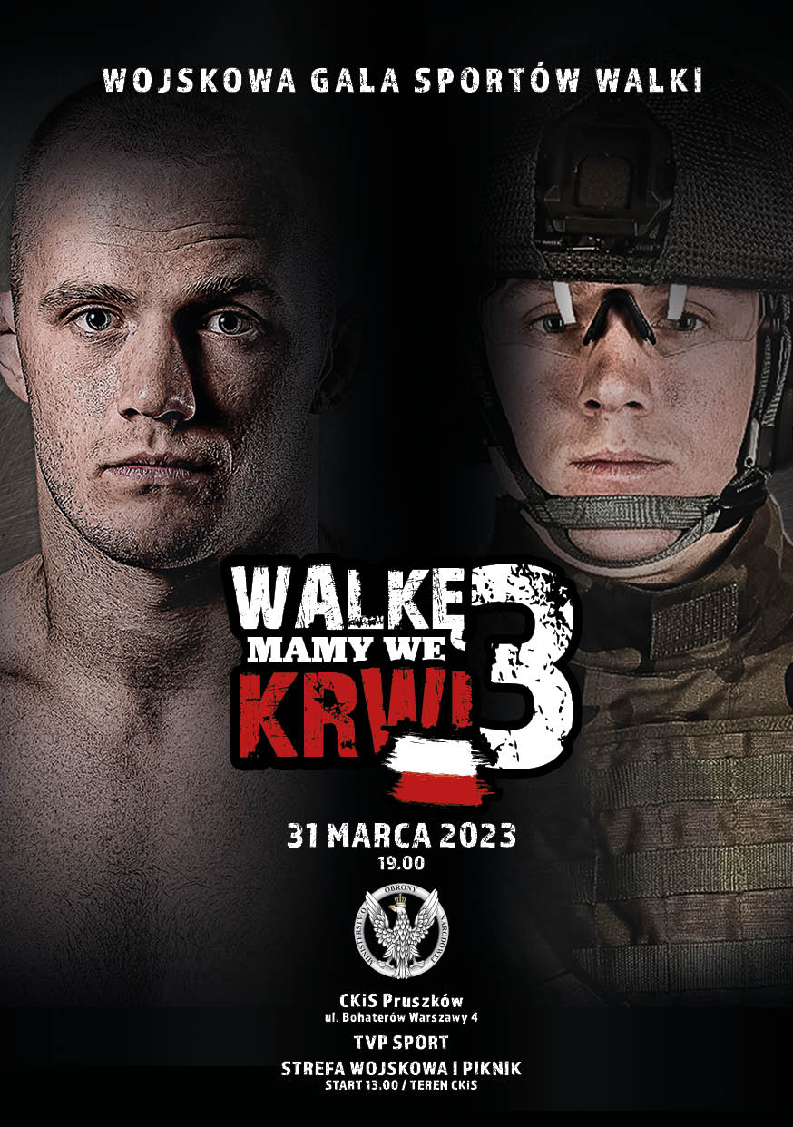31 marca, w piątek, od godz. 19.00, wystartuje wojskowa gala sportów walki „Walkę Mamy We Krwi” 3. Kilkanaście walk z udziałem żołnierzy Wojska Polskiego odbędzie się w Pruszkowie – w hali Centrum Kultury i Sportu w Pruszkowie (ul. Bohaterów Warszawy 4). Gala „Walkę Mamy We Krwi” to niezapomniane emocje sportowe oraz atrakcyjne wyzwanie z udziałem Wojska Polskiego.