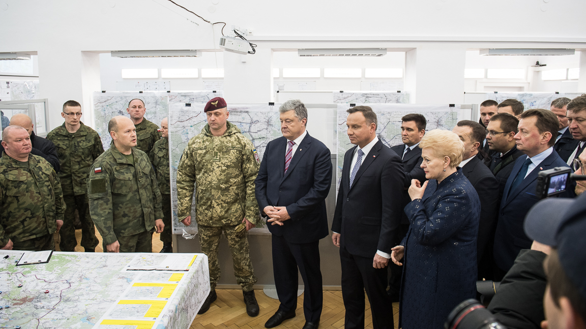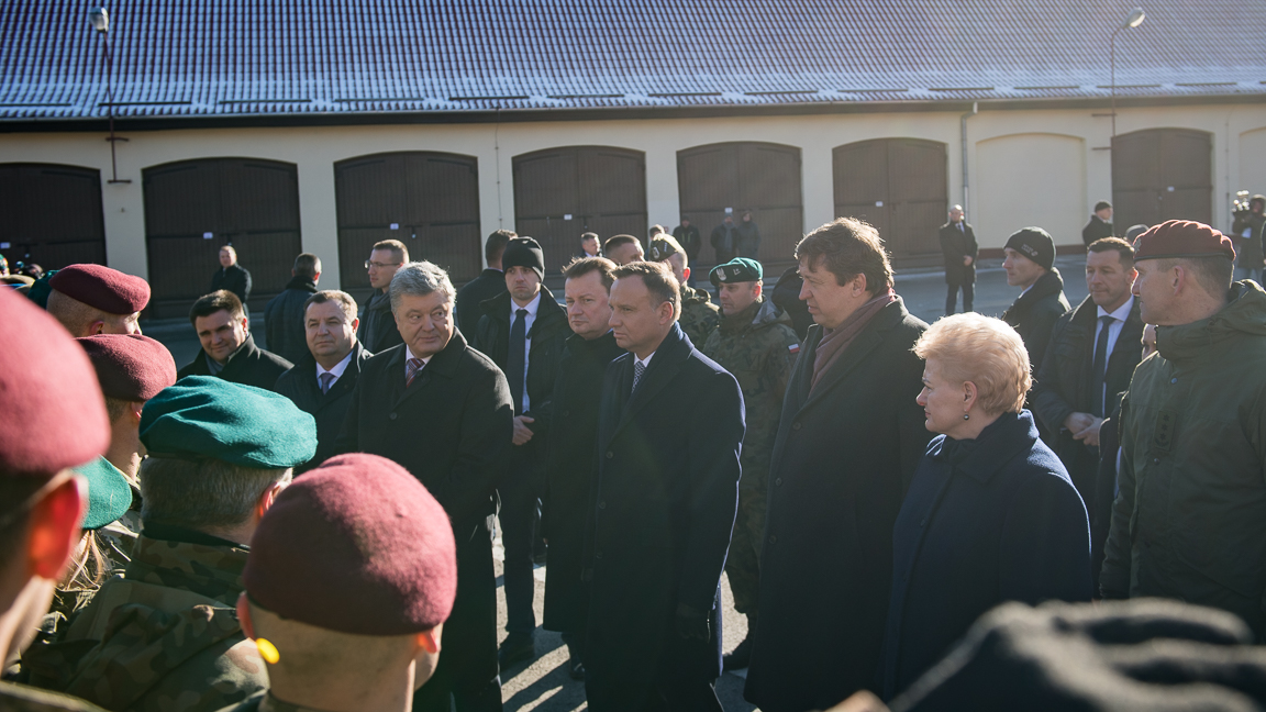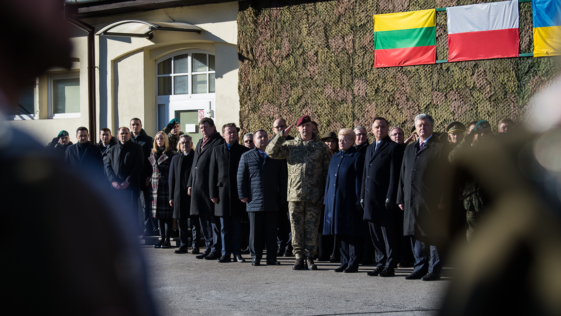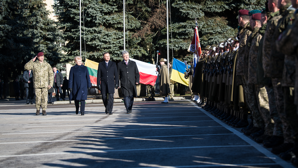 Prezydenci Polski, Litwy i Ukrainy Andrzej Duda, Dalia Grybauskaite i Petro Poroszenko rozmawiali z żołnierzami Wielonarodowej Brygady Litewsko-Polsko-Ukraińskiej im. Wielkiego Hetmana Konstantego Ostrogskiego w Lublinie.
