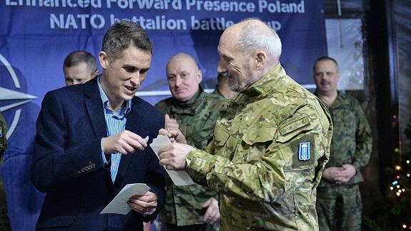 Minister obrony narodowej Antoni Macierewicz i sekretarz obrony Wielkiej Brytanii Gavin Alexander Williamson odwiedzili w piątek żołnierzy Batalionowej Grupy Bojowej NATO na terenie Ośrodka Szkolenia Poligonowego Wojsk Lądowych Orzysz w Bemowie Piskim.