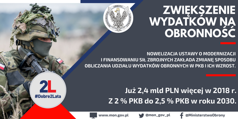 W MON powstał przełomowy projekt nowelizacji ustawy o modernizacji i finansowaniu SZ RP, który zakład wzrost nakładów na obronność państwa. Ustawa przyjęta przez Sejm 15.09 br przewiduje wzrost z 2%PKB do 2,5% PKB docelowo w roku 2030.