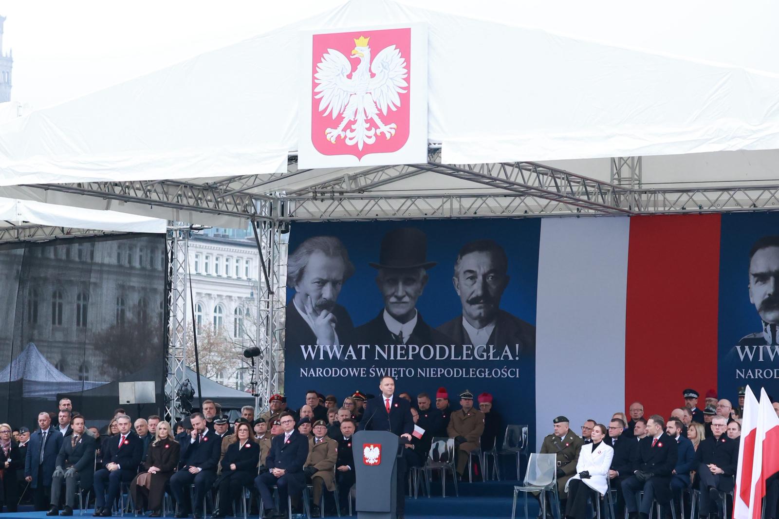 Granica polskiego bezpieczeństwa jest dziś na froncie ukraińsko-rosyjskim. Pomoc dla walczącej Ukrainy – zarówno ze względów humanitarnych, jak i ze względu na nasz własny interes narodowy – jest konieczna. Zagrożenie w czasach rozbiorów przychodziło i ze wschodu, i z zachodu. Dziś na zachodzie mamy sojuszników – w Unii Europejskiej i w NATO. Najbardziej zagrażają nam ci, którzy są na wschodzie, niosący pożogę, zniszczenie i śmierć. Im zawsze trzeba się przeciwstawiać. Wierzę, że wszyscy tak jak tu zgromadzeni odczytujemy tę rację stanu i ją realizujemy. To zobowiązanie wobec ojców niepodległości, wobec dzieci niepodległej, wobec przyszłych pokoleń. Polska jest dziś latarnią dla Europy. I musi nią być – dawać sygnały, wskazywać kierunek. W ostatnich latach nieraz pokazaliśmy, że potrafimy wyprzedzać, nieść światło i wskazywać drogę.