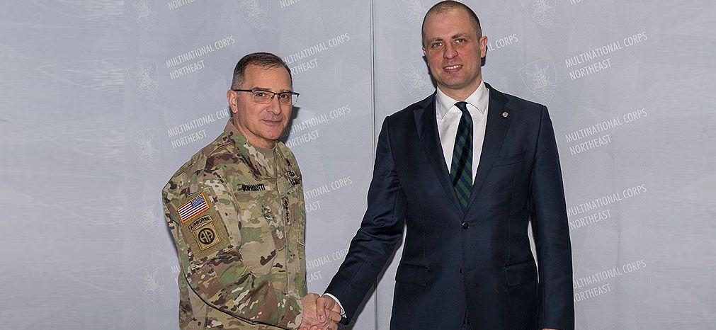 Podsekretarz stanu w MON Tomasz Szatkowski spotkał się w Kwaterze Głównej Wielonarodowego Korpusu Północ-Wschód z dowódcą połączonych sił NATO w Europie generałem Curtisem M. Scaparrottim 3 kwietnia 2018 roku w Szczecinie.