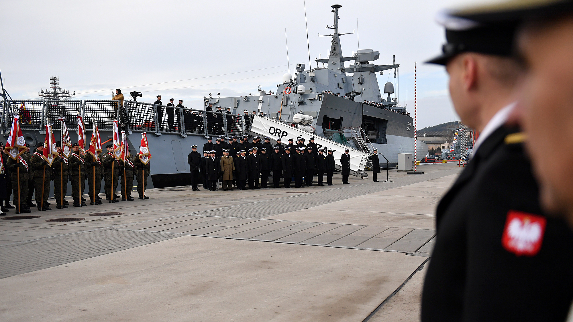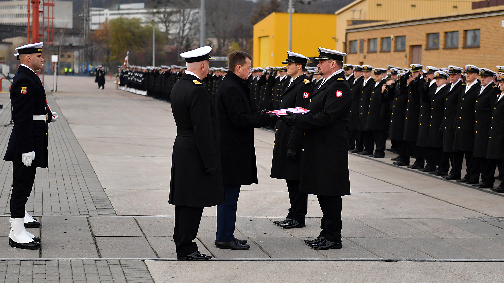 W trakcie uroczystości minister Mariusz Błaszczak wręczył dowódcy ORP Ślązak banderę wojenną, a zastępcy dowódcy przekazał proporzec Marynarki Wojennej.