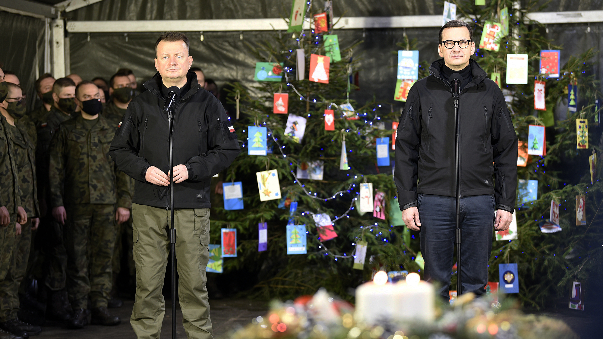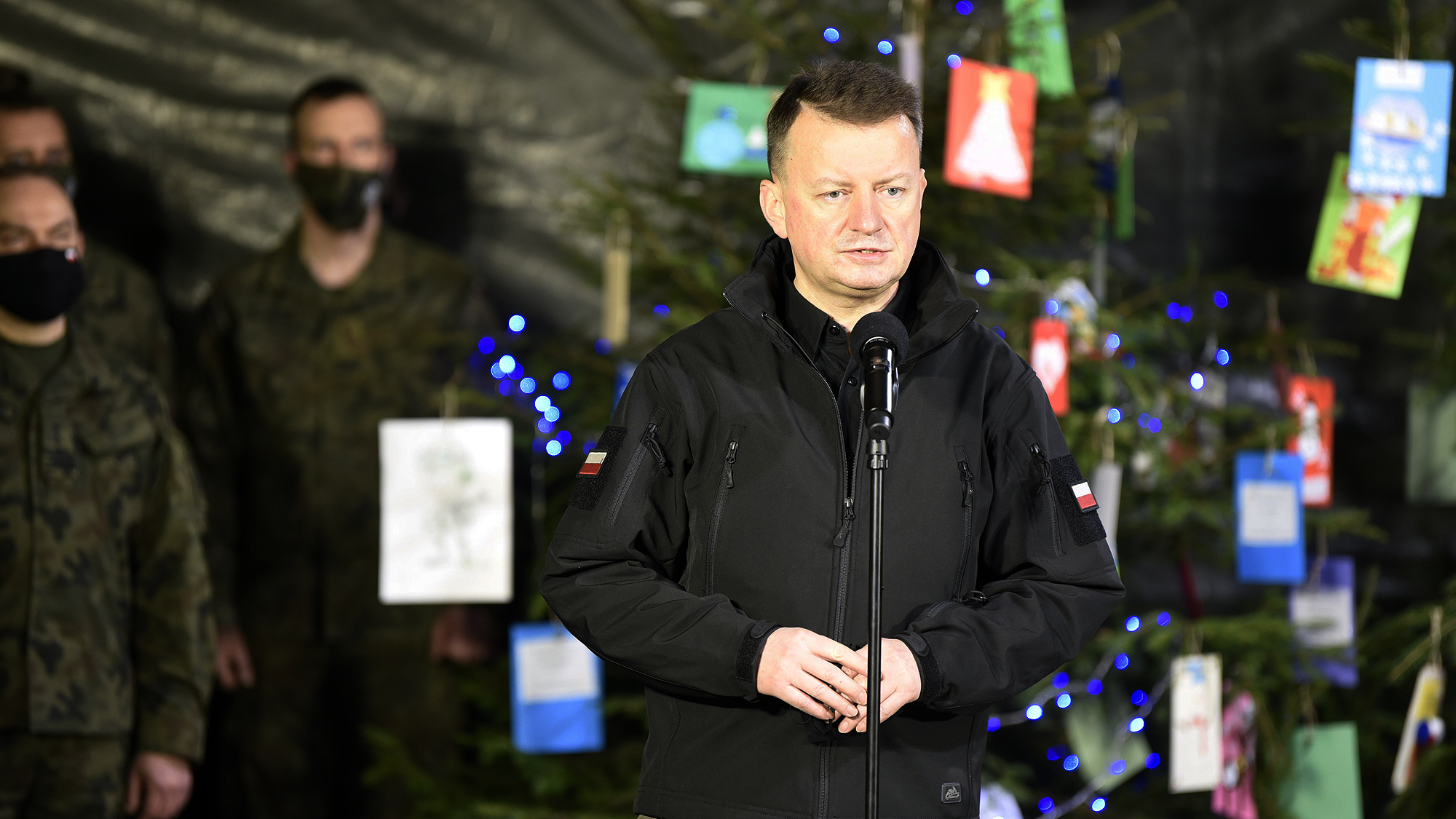 „Dziękuję za Waszą codzienną służbę, tu na granicy polsko-białoruskiej, stanowiącej jednocześnie granicę Unii Europejskiej i państw należących do Sojuszu Północnoatlantyckiego. Dziękuję za Waszą postawę i Wasz wysiłek. Gdyby nie ona, to sytuacja byłaby kryzysowa. Wy doprowadziliście do tego, że Polska jest bezpieczna. Poprzez Waszą postawę, Wasz profesjonalizm, poprzez twardość charakterów. Za to Wam wszystkim dziękuję” - powiedział Mariusz Błaszczak, minister obrony narodowej podczas wigilijnego spotkania z żołnierzami Wojska Polskiego służącymi na granicy.