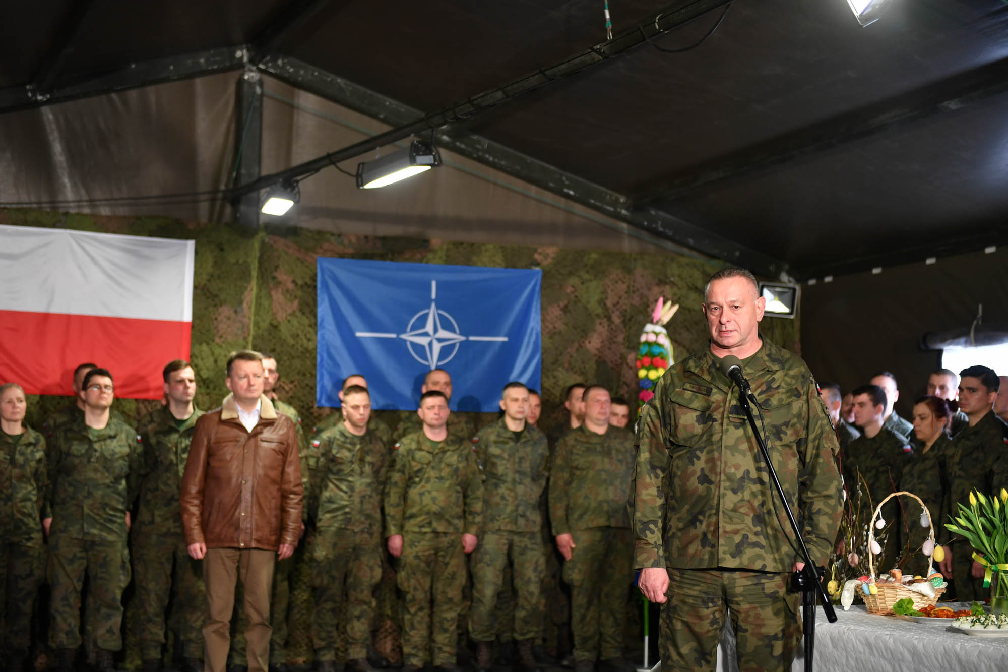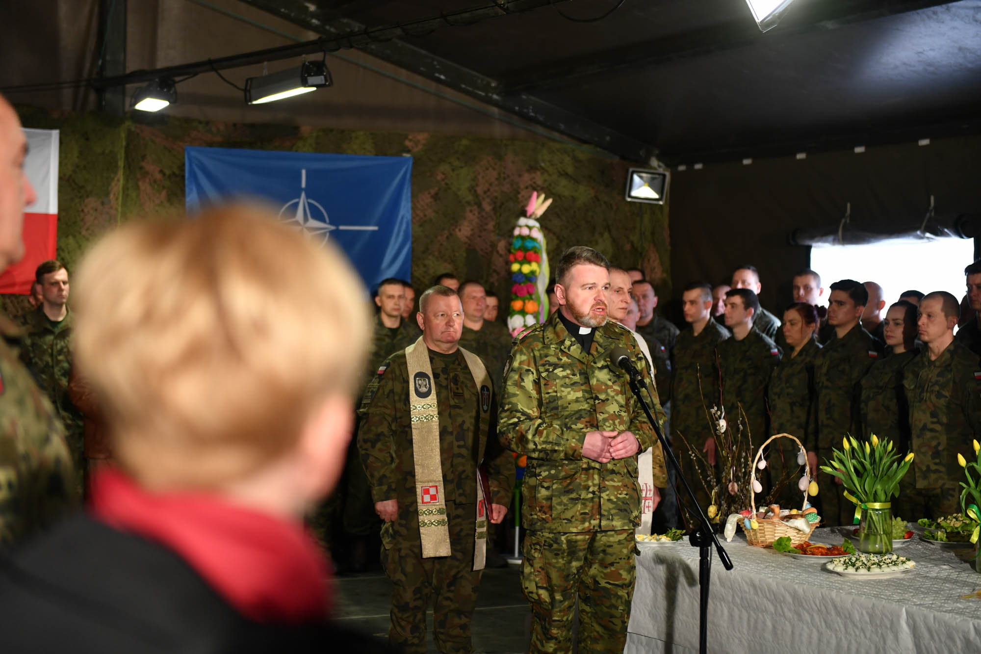 „Są z nami żołnierze zarówno wojsk operacyjnych, jak i Wojsk Obrony Terytorialnej. Razem strzeżecie bezpieczeństwa naszej Ojczyzny. Święta Wielkanocne to święta niezwykłe ważne dla każdego chrześcijanina, to święta, w których rozważamy zmartwychwstanie Jezusa Chrystusa, to święta, które są symbolem zwycięstwa dobra nad złem i życia nad śmiercią. Bezpieczeństwo Polski jest zadaniem, które wypełniacie, jest zadaniem, które wypełniacie z pełnym poświęceniem. W tych trudnych czasach, dlatego, że zaraz za naszą wschodnią granicą toczy się wojna. Ukraina została napadnięta przez Rosję. Na Ukrainie dochodzi do zbrodni wojennych. Naszym zadaniem jest zapewnienie bezpieczeństwa naszej Ojczyźnie, a wy żołnierze Wojska Polskiego wykonujecie to zadanie perfekcyjnie”