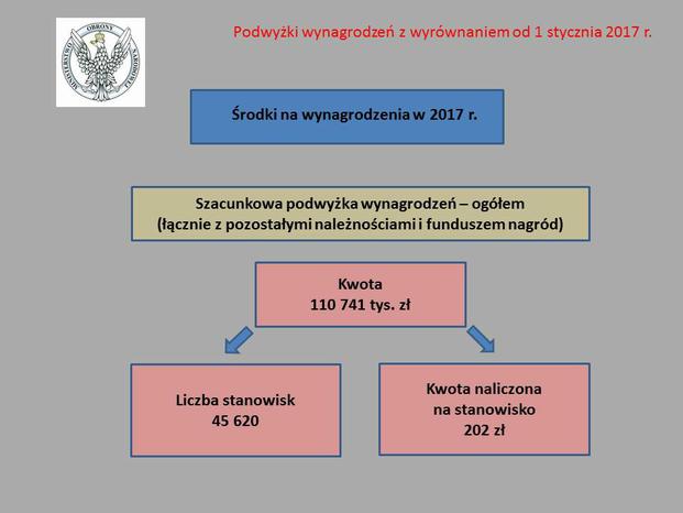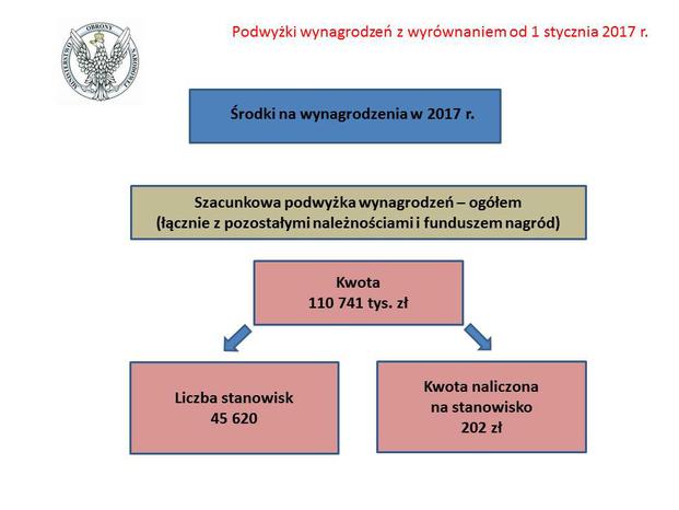 Przeciętna wysokość podwyżki dla ok. 45 tys. pracowników resortu wyniesie ok. 202 zł z uwzględnieniem skutków wypłat dodatkowych należności, takich jak np. nagrody jubileuszowe, odprawy emerytalne itp. To kolejna planowana podwyżka po wprowadzonej w 2015 r. przez kierownictwo MON nowej polityki wynagrodzeń dla tej grupy zawodowej (w 2016 r. przeciętne wynagrodzenie, w porównaniu z rokiem 2015 r., wzrosło średnio o 9,44%).