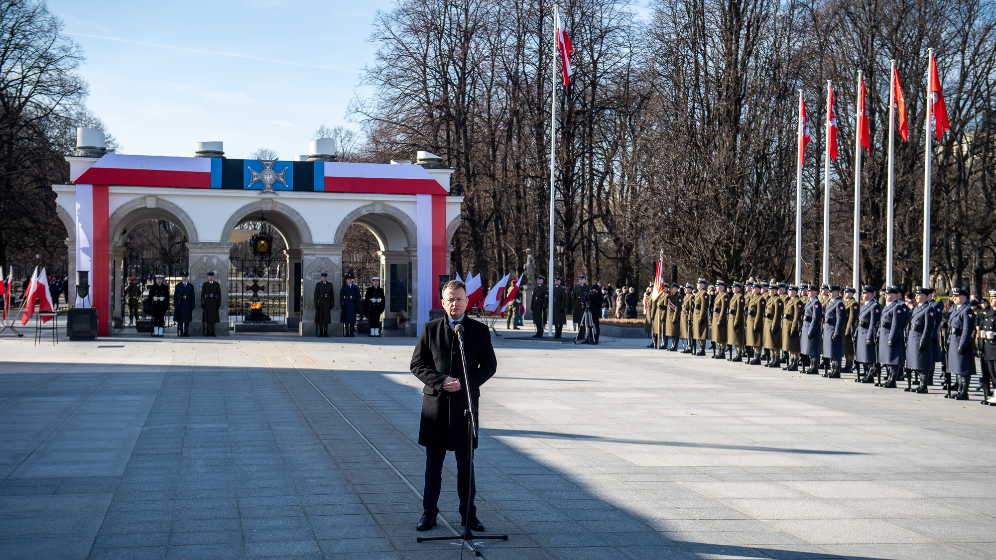 „Spotykamy się dziś w tym szczególnym miejscu, przy Grobie Nieznanego Żołnierza, żeby oddać cześć żołnierzom Armii Krajowej, żeby oddać cześć bohaterom, którzy poświęcili swoje życie dla wolnej Polski. 80 lat temu, Wódz Naczelny wydał rozkaz, na podstawie którego Związek Walki Zbrojnej został przekształcony w Armię Krajową. To była armia państwa podziemnego. To była armia, która stanowiła wojskowe ramię państwa podziemnego. To była armia, której zadaniem była walka o wolną Polskę. Zadanie zostało spełnione na tyle, na ile mogło być spełnione w tamtych czasach” - powiedział Mariusz Błaszczak, minister obrony narodowej, podczas uroczystych obchodów 80. rocznicy powstania Armii Krajowej w Warszawie.