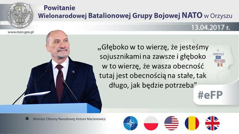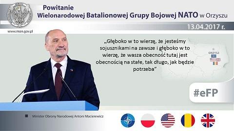 – Żołnierze NATO przybyli do Orzysza, by bronić i odstraszać każdego wroga, który mógłby zagrozić Polsce i naszym sojusznikom – powiedział w czwartek szef MON Antoni Macierewicz podczas powitania batalionu NATO. Szef MON zaznaczył, że obecność w batalionowej grupie żołnierzy z USA, Wielkiej Brytanii i Rumunii oraz wkrótce Chorwacji, to dobry znak naszej solidarności, spójności i determinacji, by razem bronić flanki wschodniej NATO.