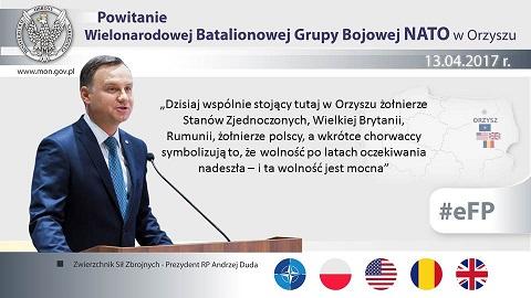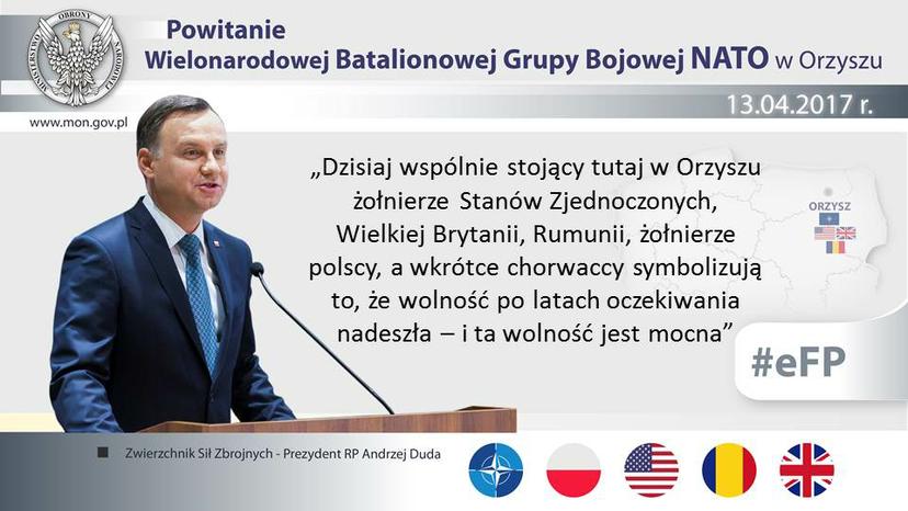 W czwartek na Strzelnicy Czołgowej i Wozów Bojowych Wierzbiny na terenie Ośrodka Szkolenia Poligonowego Wojsk Lądowych Orzysz, Prezydent Rzeczypospolitej Polskiej Andrzej Duda uczestniczył w powitaniu Batalionowej Grupy Bojowej NATO. W wydarzeniu udział wziął także minister obrony narodowej Antoni Macierewicz, Naczelny Dowódca Sił NATO w Europie gen. Curtis Scaparrotti oraz ambasadorowie i wojskowi przedstawiciele państw, których wojska wchodzą w skład Batalionowej Grupy Bojowej.