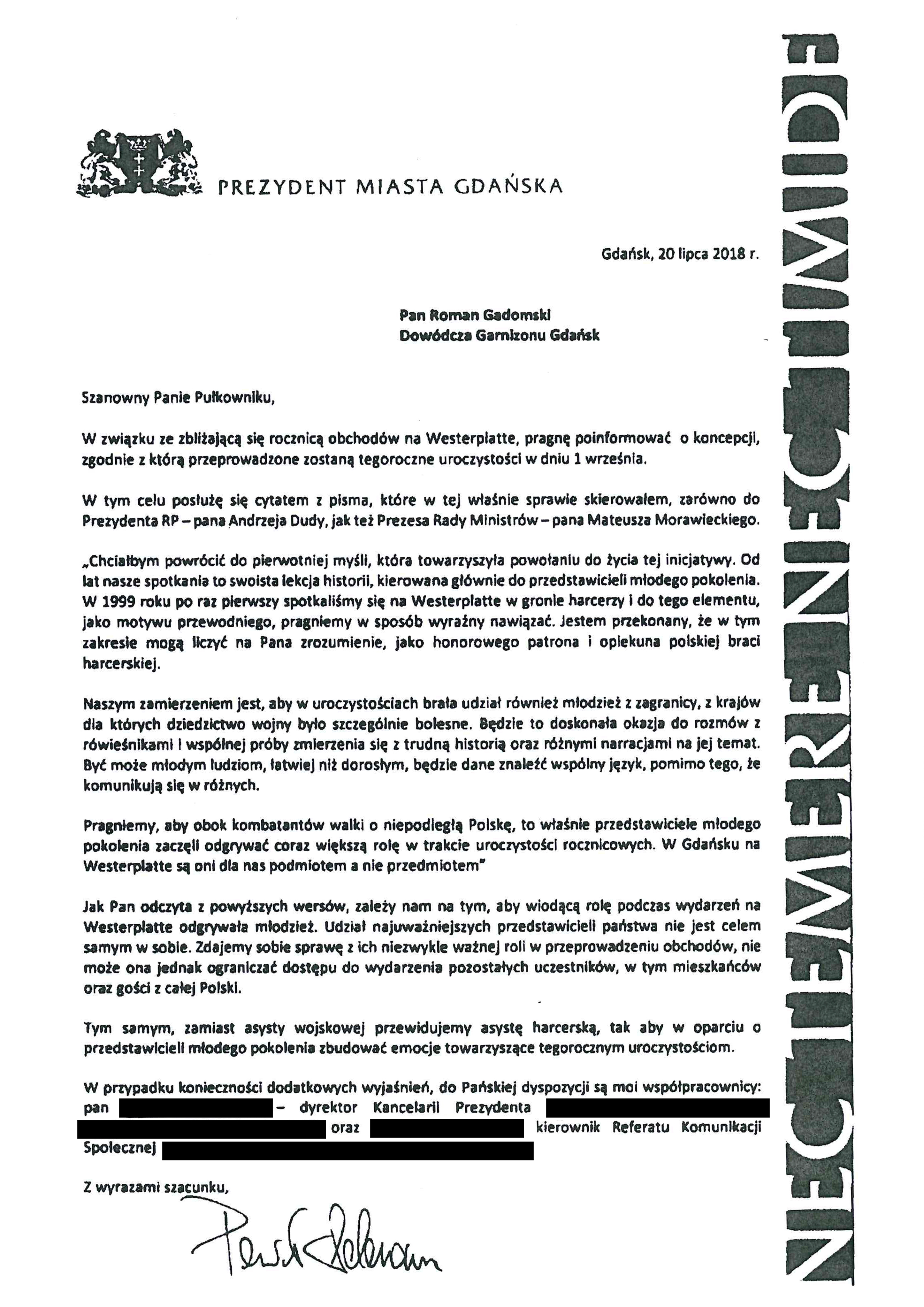 Zamiast tego skierował pismo, w którym jasno podkreślił, że w tym roku podczas rocznicy wybuchu II Wojny Światowej przewiduje udział jedynie asysty harcerskiej.