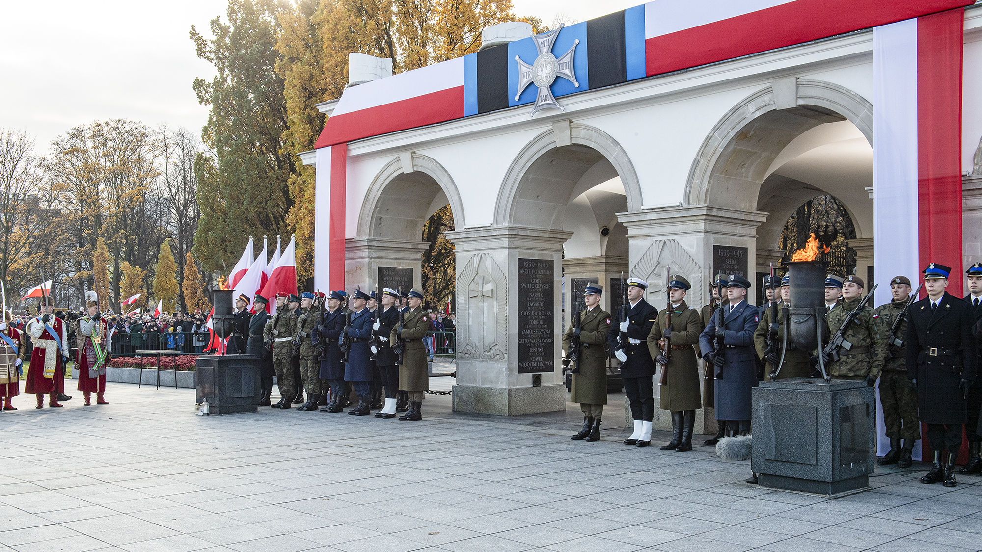 W południe, z okazji 101. rocznicy odzyskania przez Polskę niepodległości, w szczególnym miejscu - na placu Marszałka Józefa Piłsudskiego w Warszawie - rozpoczęła się uroczysta odprawa wart przed Grobem Nieznanego Żołnierza. Dowódcy wart wystawionych przez formacje wszystkich Rodzajów Sił Zbrojnych oraz innych służb mundurowych, złożyli meldunki dowódcy uroczystości o gotowości do pełnienia warty przy najważniejszym wojskowym pomniku. Żołnierze dokonali także zmiany posterunku honorowego przed Grobem Nieznanego Żołnierza.