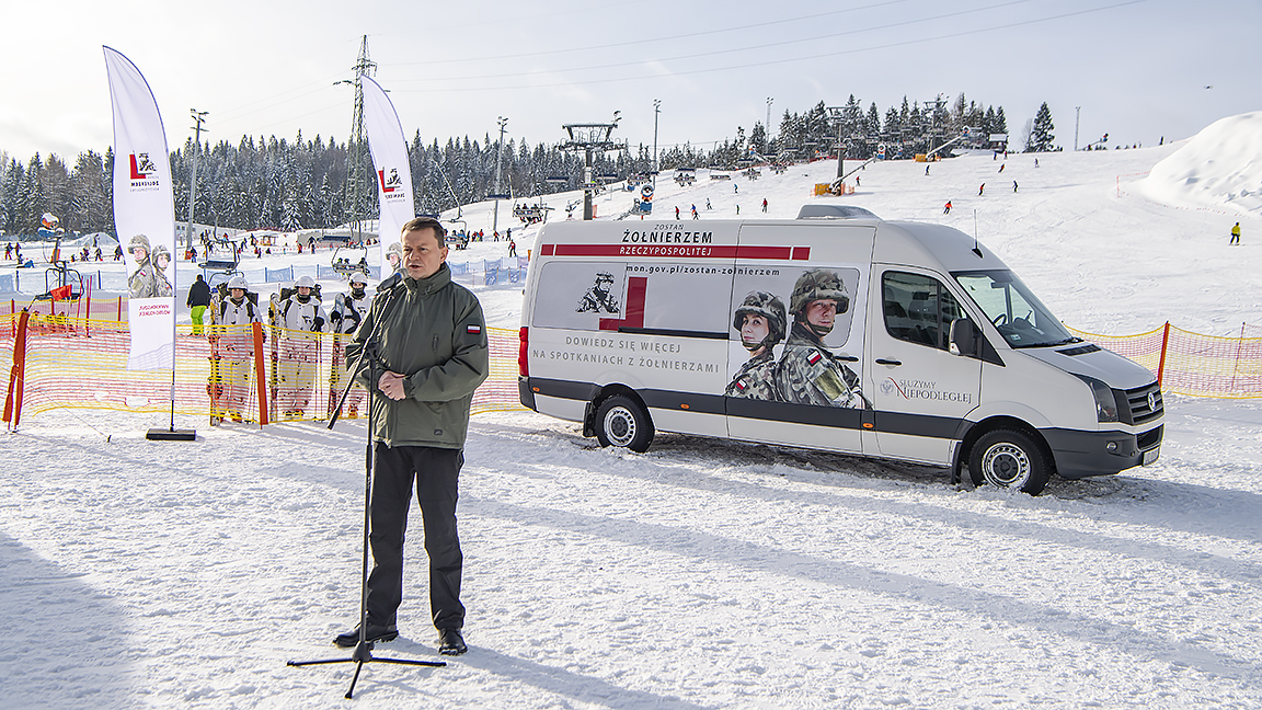 Minister Błaszczak w sobotę otworzył mobilny wojskowy punkt rekrutacyjny przy stoku narciarskim w Białce Tatrzańskiej. Podczas ferii żołnierze będą przyjeżdżali wojskowymi samochodami oznakowanymi logiem kampanii do narciarskich ośrodków sportowych i tam, często pod samymi wyciągami będą spotykali się z potencjalnymi kandydatami do wojska.