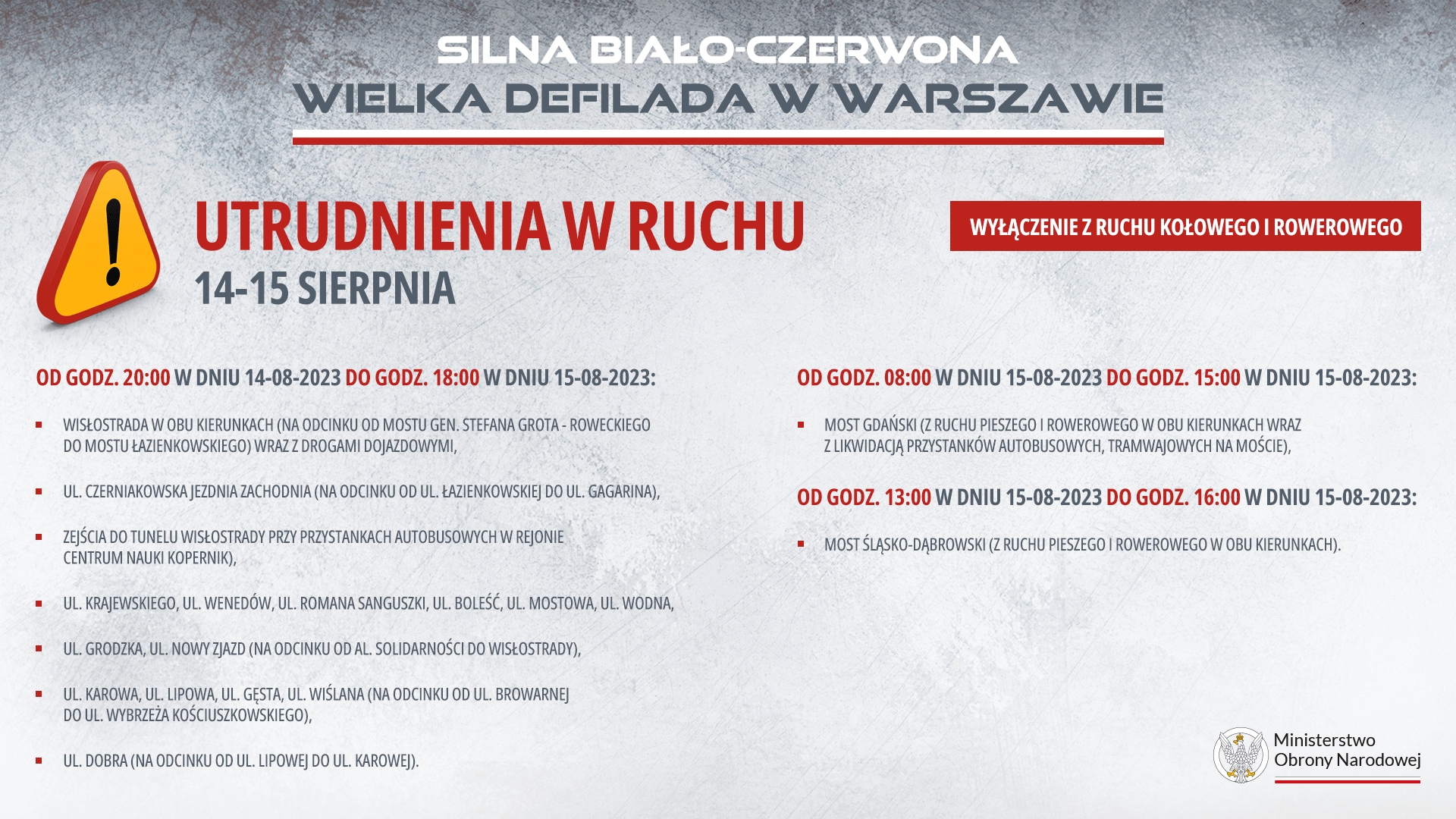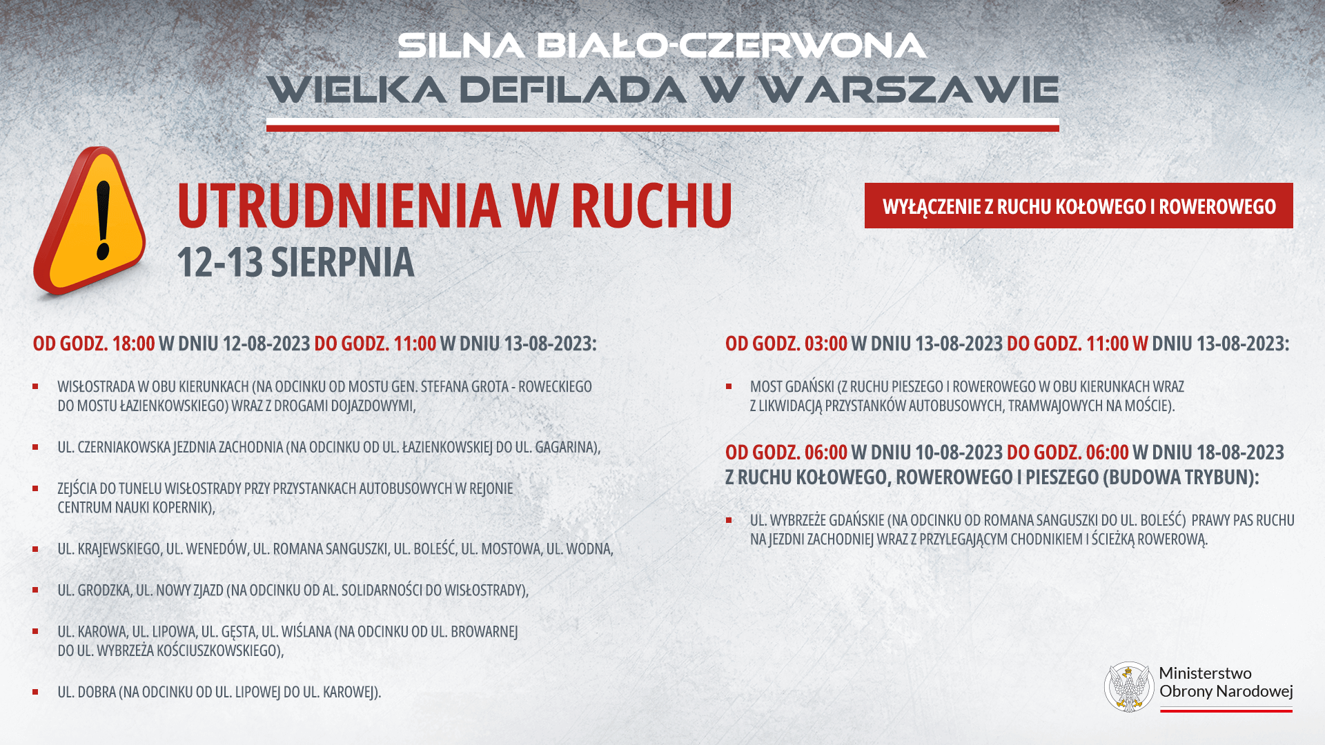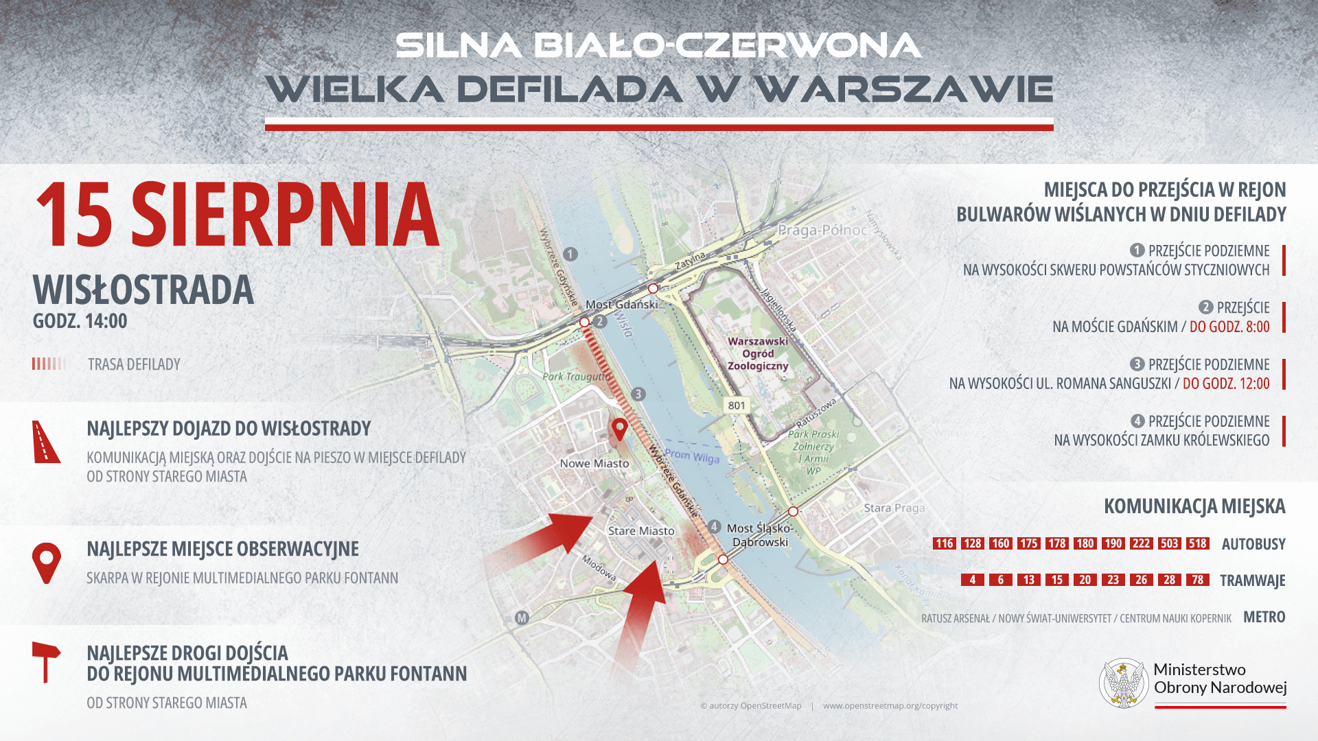 - następnie – pieszo (spacer max. kilkanaście minut) – skieruj się w stronę Wisły i Wisłostrady - a dokładnie do Multimedialnego Parku Fontann (skarpa) lub Bulwarów Wiślanych (przejścia podziemne: na wysokości Zamku Królewskiego, skweru Powstańców Styczniowych, przejście na wysokości ul. Sanguszki-czynne do 12.00, przejście na moście Gdańskim czynne do 8.00). Tam znajdziesz najlepsze miejsca widokowe. Defiladę będzie można również obserwować na całej trasie – czyli od Cytadeli Warszawskiej, aż do mostu Śląsko Dąbrowskiego.