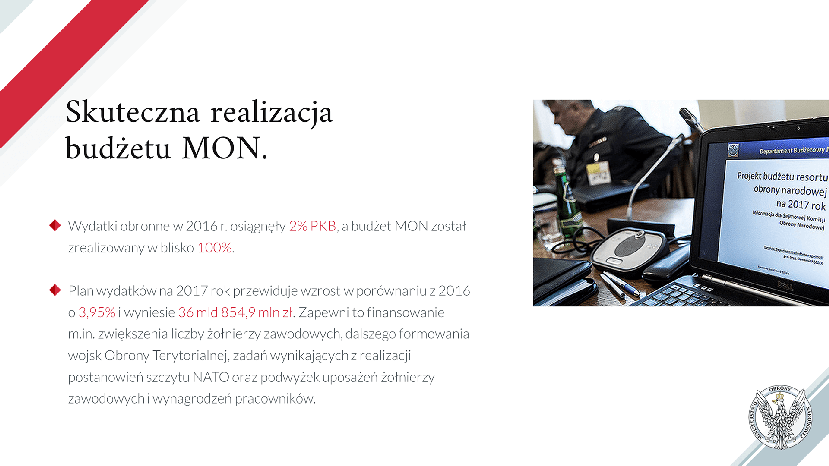 Z planowanych na 2016 r. ponad 35,4 mld zł resort wydał 99,7 proc. Wydatki majątkowe (zakupy sprzętu i uzbrojenia, jego modernizacje i remonty, inwestycje budowlane) – które powinny stanowić co najmniej jedną czwartą budżetu obronnego – wyniosły 27,8 procent.