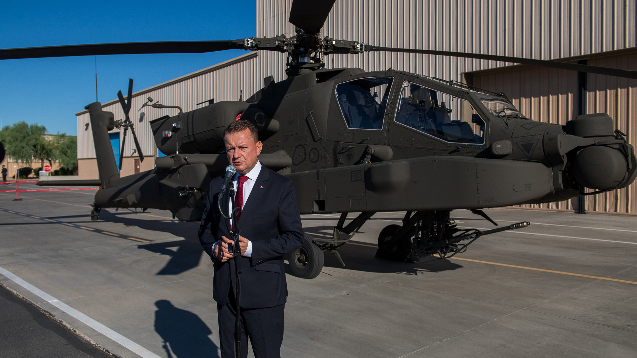 - Zamówienie 96 śmigłowców jest przemyślane. To jest dokładnie taka liczba, która jest nam potrzebna, żeby realnie i skutecznie odstraszyć agresora. Śmigłowce Apache są jednymi z najlepszych na świecie. Świetnie współpracują właśnie z czołgami. Nasza dywizja, 18 Dywizja Zmechanizowana jest budowana na wzór jednostek amerykańskich. Dziękuję za ścisła współpracę. Szczególnie z V Korpusem US Army, którego wysunięty element na stałe, co bardzo mocno podkreślam, stacjonuje w Polsce. Regularnie odbywają się szkolenia, gdzie polscy żołnierze wspólnie z żołnierzami amerykańskimi podnoszą swoje umiejętności. Przyjmujemy najlepsze wzorce. Dlatego, że wojska amerykańskie, wojska lądowe amerykańskie są najsilniejsze na świecie, a więc uczymy się od najlepszych. Naszym celem jest to, żeby nie dopuścić do wtargnięcia Rosji. Wszyscy doskonale wiemy o próbach odbudowy imperium rosyjskiego. Najlepszą odpowiedzią na te próby jest stworzenie silnego Wojska Polskiego. Ten proces się właśnie odbywa. Dziś Wojsko Polskie liczy 180 tysięcy żołnierzy pod bronią