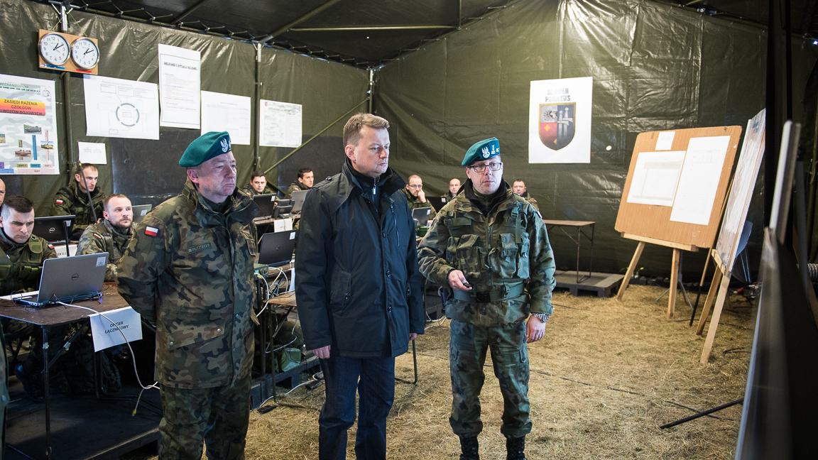 Szef MON uczestniczył w Orzyszu w odprawie dotyczącej gotowości mobilizacyjnej prowadzonej przez Sztab Generalny Wojska Polskiego.