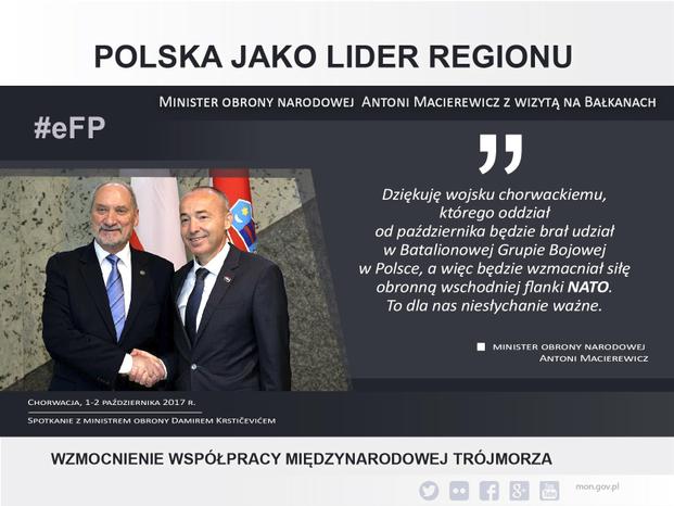 Na spotkaniu z mediami minister obrony narodowej Antoni Macierewicz podziękował chorwackiej armii za zaangażowanie w te projekty, które mają na celu zwiększenie bezpieczeństwa na wschodniej flance NATO. - Chcę podziękować ministrowi obrony Chorwacji, chorwackiemu rządowi i wojsku chorwackiemu, którego oddział od października będzie już brał udział w Batalionowej Grupie Bojowej w Polsce, a więc będzie wzmacniał siłę obronną wschodniej flanki NATO. To dla nas niesłychanie ważne. Ten wkład Chorwatów we wspólną obronę jest niesłychanie istotny.