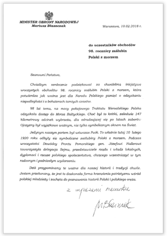 - 98 lat temu, na mocy pokojowego Traktatu Wersalskiego Polska odzyskała dostęp do Morza Bałtyckiego. Choć był to krótki, zaledwie 147 kilometrowy odcinek wybrzeża, dla odradzającej się po latach zaborów Ojczyzny był wyjątkowo ważnym, nie tylko symbolicznym oknem na Świat - napisał w liście minister obrony narodowej Mariusz Błaszczak. Szefa MON na uroczystościach w Pucku reprezentował podsekretarz stanu w MON Marek Łapiński.