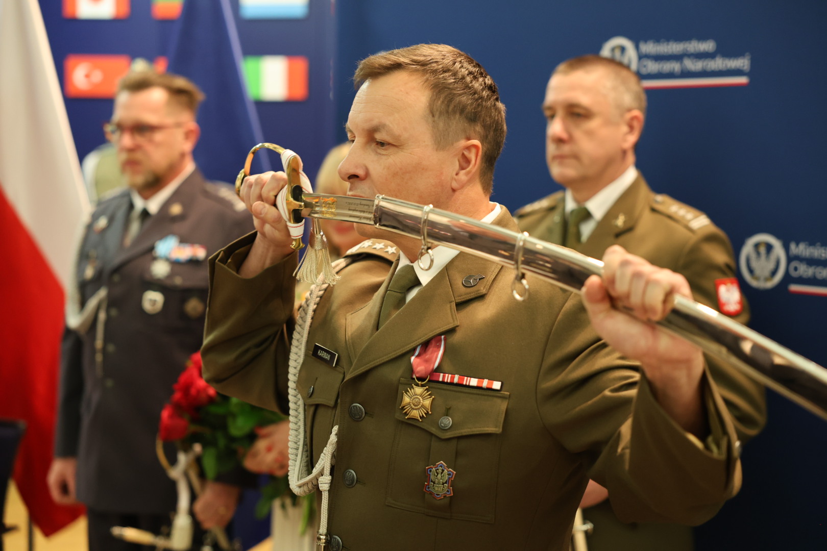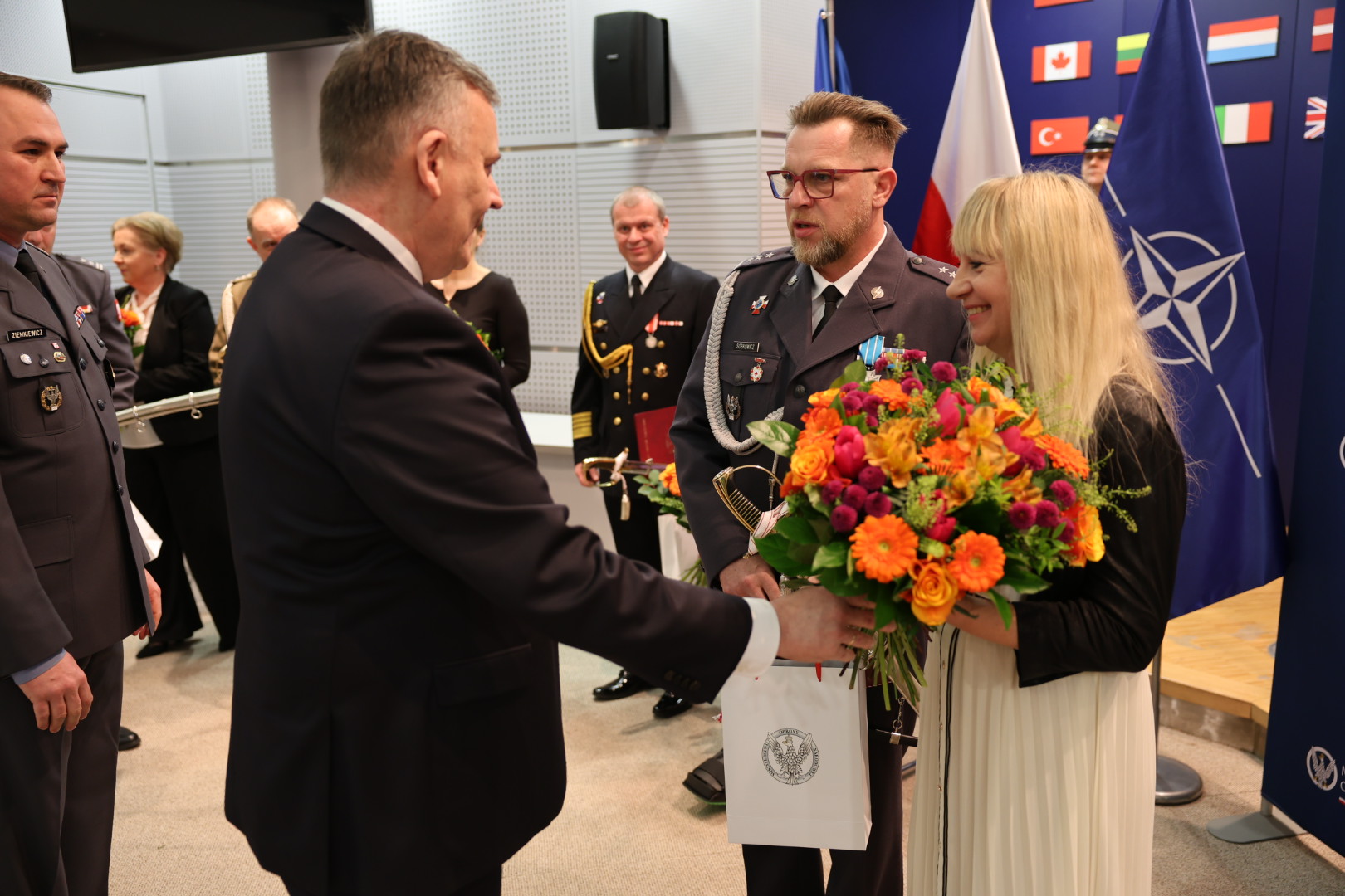 Wiceminister ON p. Paweł Bejda wręczył Szable Honorowe Wojska Polskiego oraz pamiątkowe ryngrafy żegnanym żołnierzom oraz bukiety kwiatów małżonkom uczestniczącym w tej uroczystości.
