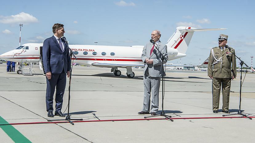 – Do służby w polskich siłach zbrojnych wchodzi samolot mający dawać i gwarantować bezpieczeństwo ludziom wybranym przez naród, aby gwarantowali pokój, dobrobyt, aby gwarantowali bezpieczeństwo Polsce i całemu narodowi, wszystkim ludziom – powiedział minister Antoni Macierewicz po przebazowaniu samolotu Gulfstream G550 do 1. Bazy Lotnictwa Transportowego w Warszawie.