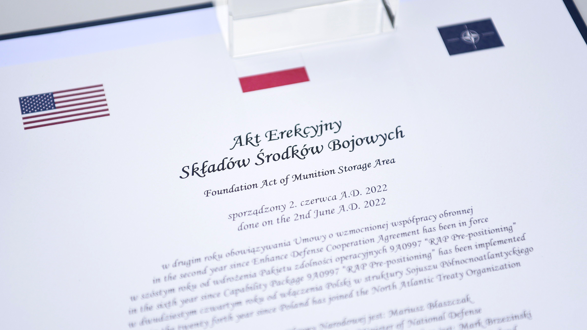 Akt erekcyjny razem z ministrem Mariuszem Błaszczakiem podpisał Ambasador Stanów Zjednoczonych Ameryki Marek Brzeziński oraz Przewodniczący Komitetu Inwestycyjnego NATO Emanuele Mela.